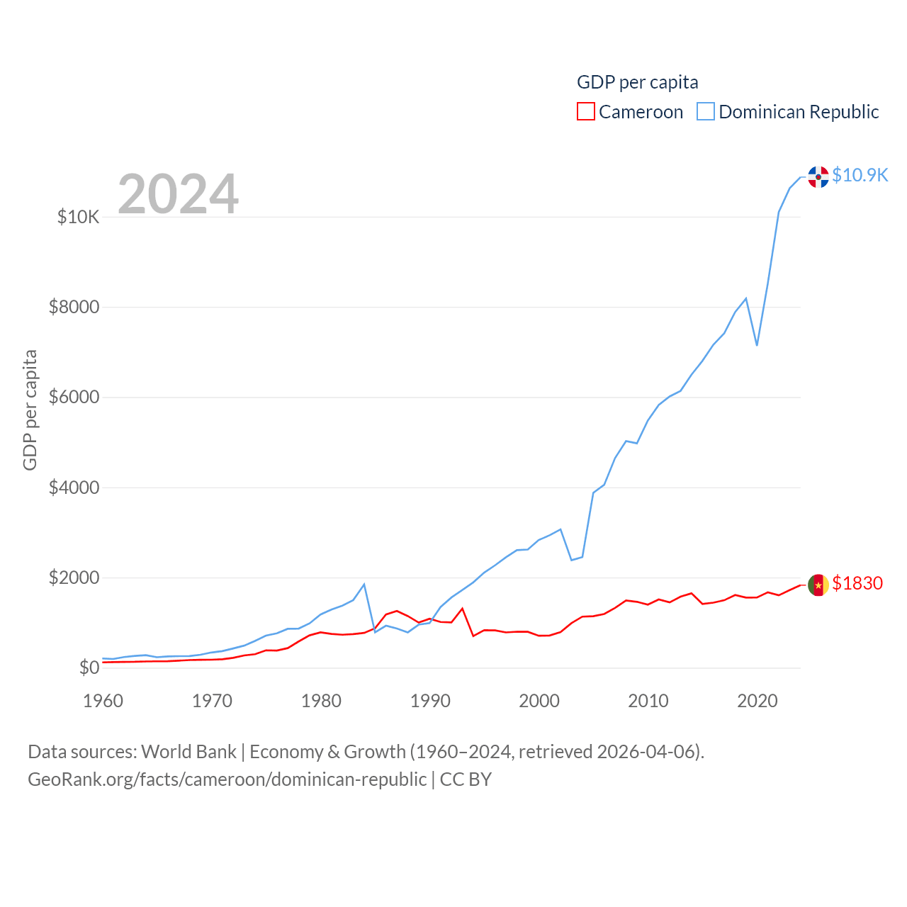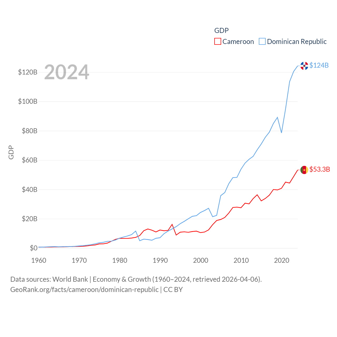 By GDP, Cameroon ranks 91/197 ($53.3B) and The Dominican Republic ranks 63/197 ($124B). By GDP per capita, Cameroon ranks 158/197 ($1,830), while The Dominican Republic ranks 83/197 ($10,876).