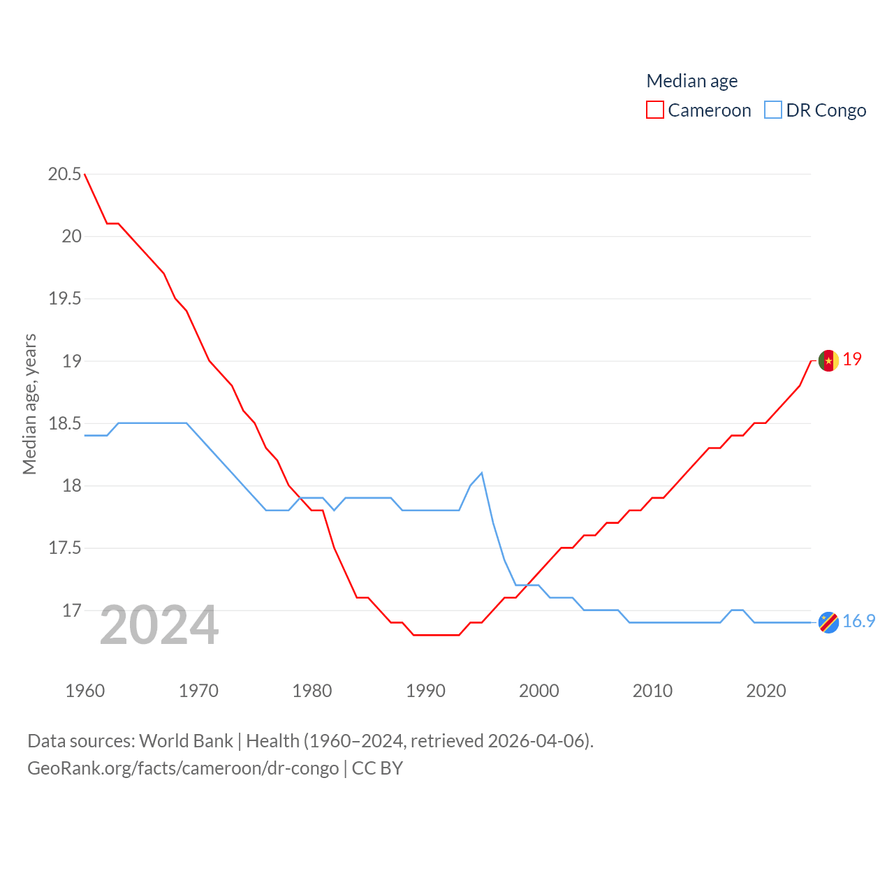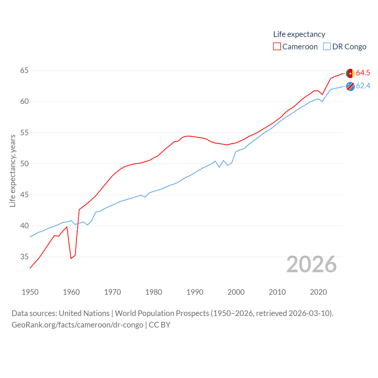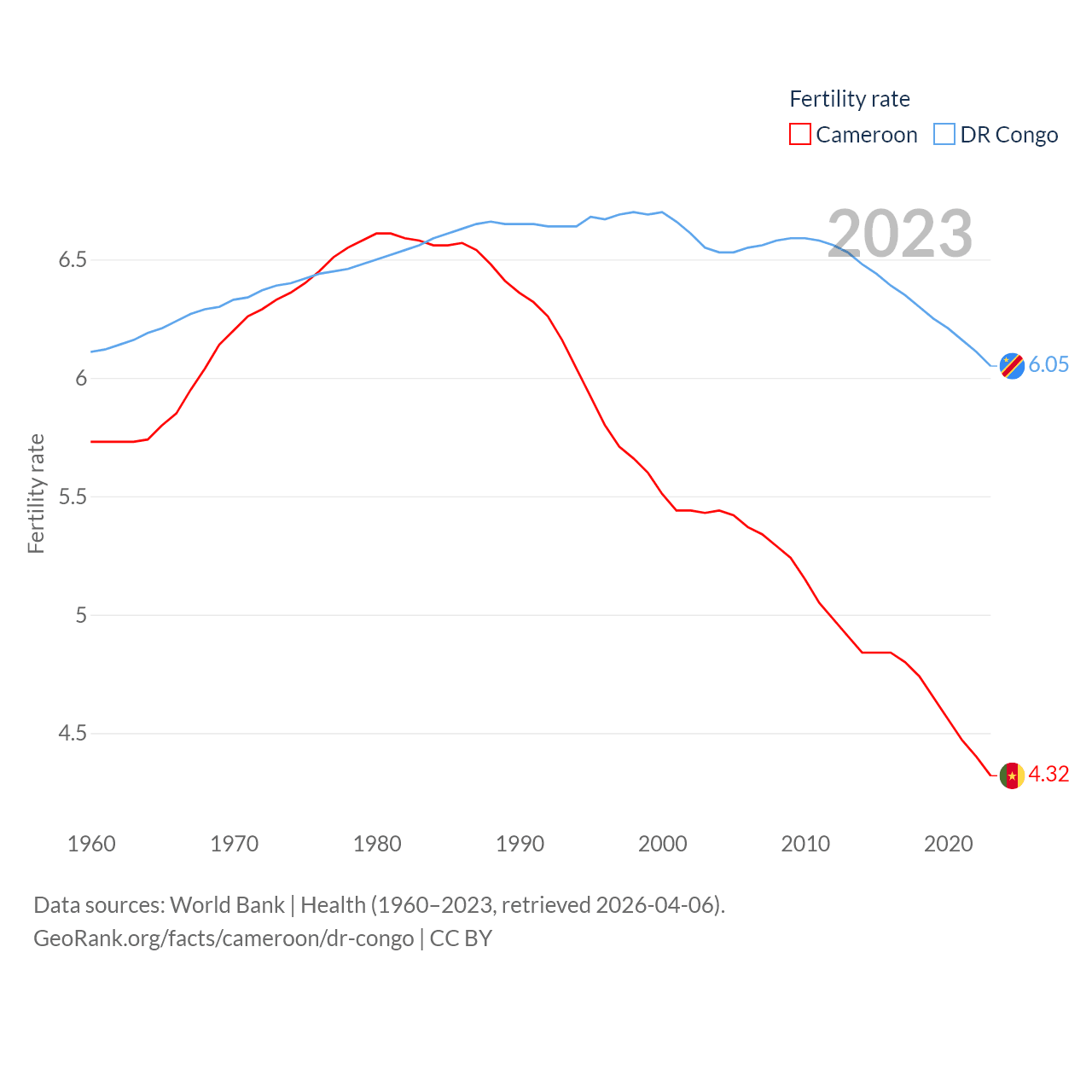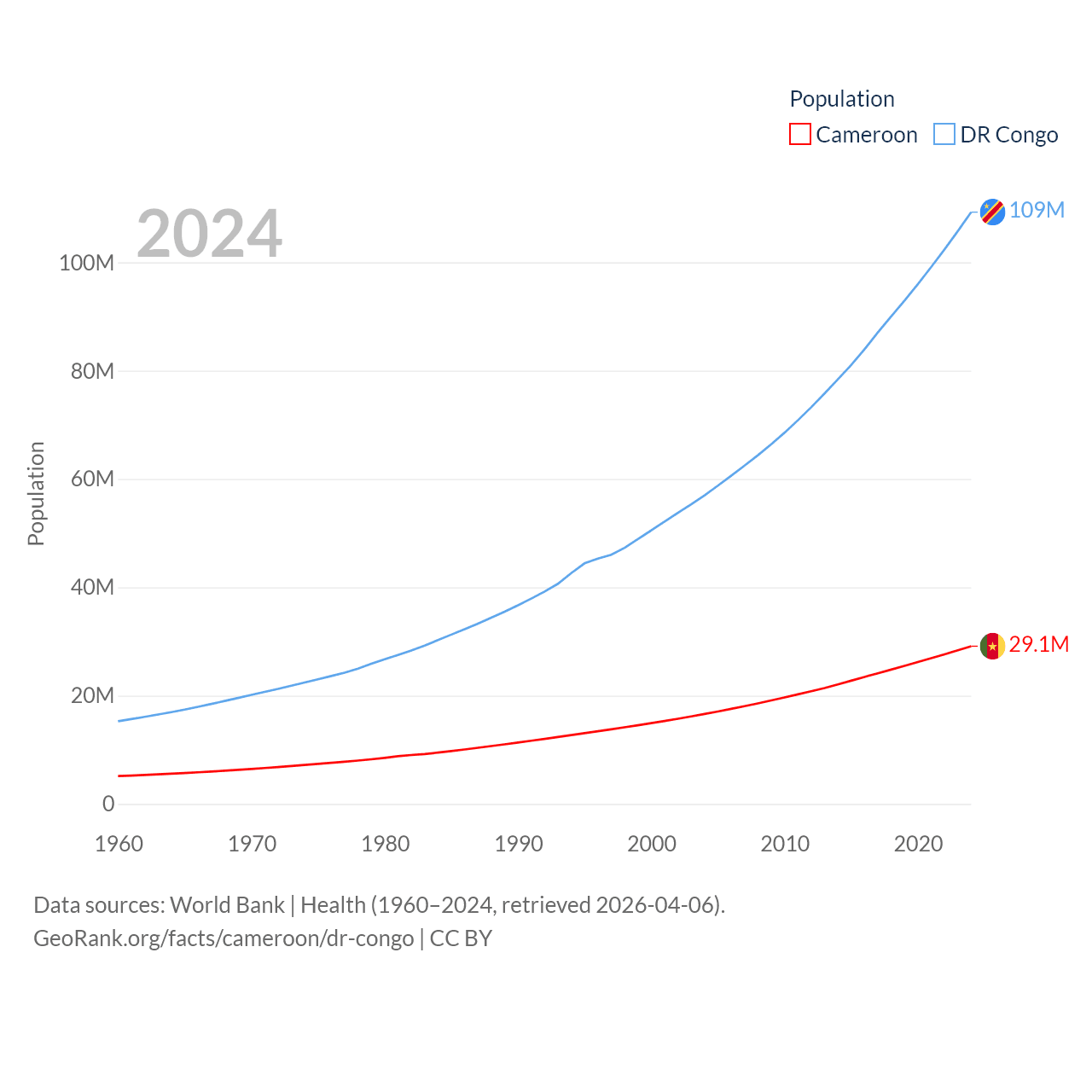 Cameroon has a population of 29.1M (ranked 52/197), compared with 109M in The DR Congo (ranked 15/197). Cameroon's land area is 182,514 sq mi versus 875,313 sq mi for The DR Congo (ranked 52nd vs. 11th).