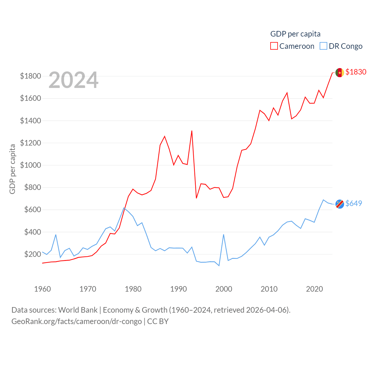 By GDP, Cameroon ranks 91/197 ($53.3B) and The DR Congo ranks 87/197 ($71B). By GDP per capita, Cameroon ranks 158/197 ($1,830), while The DR Congo ranks 190/197 ($649).