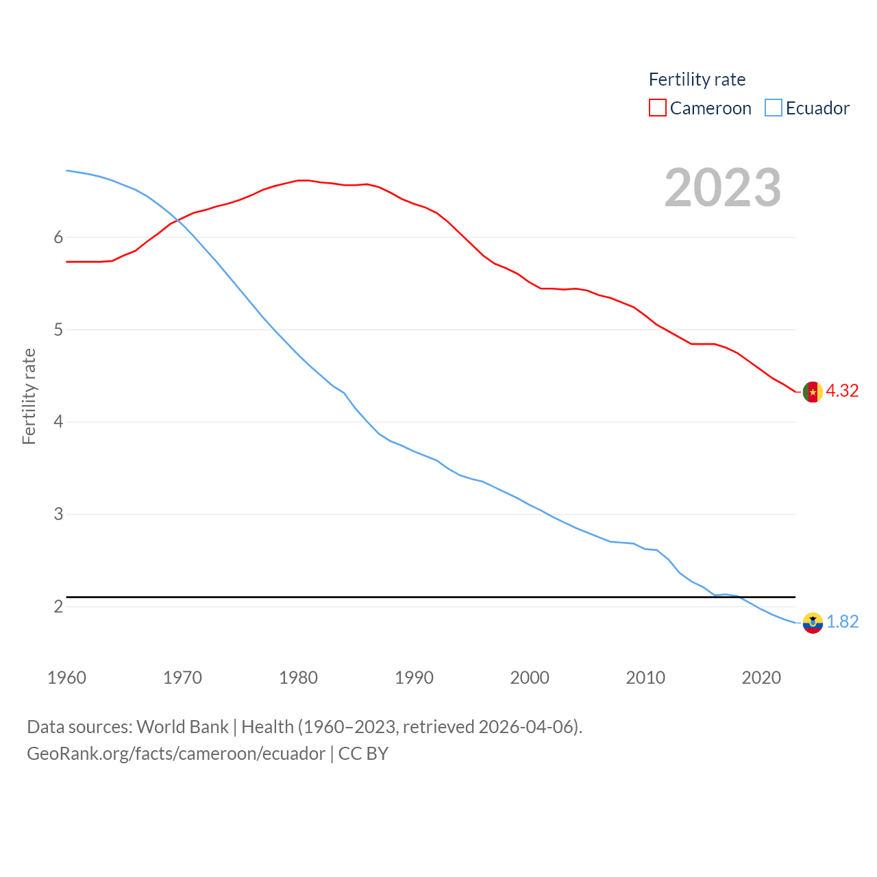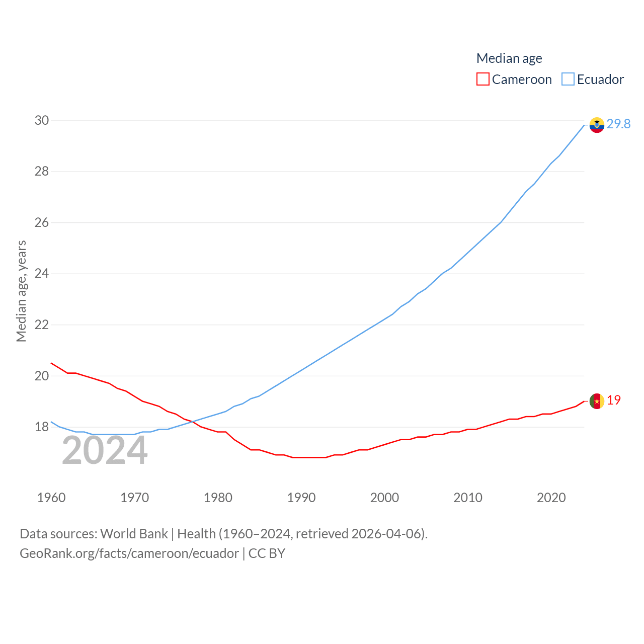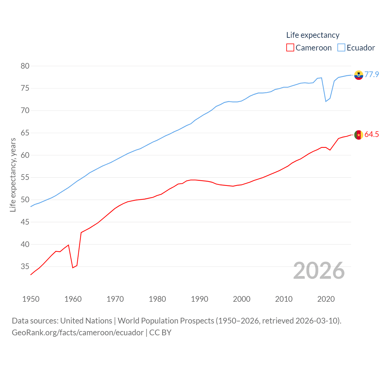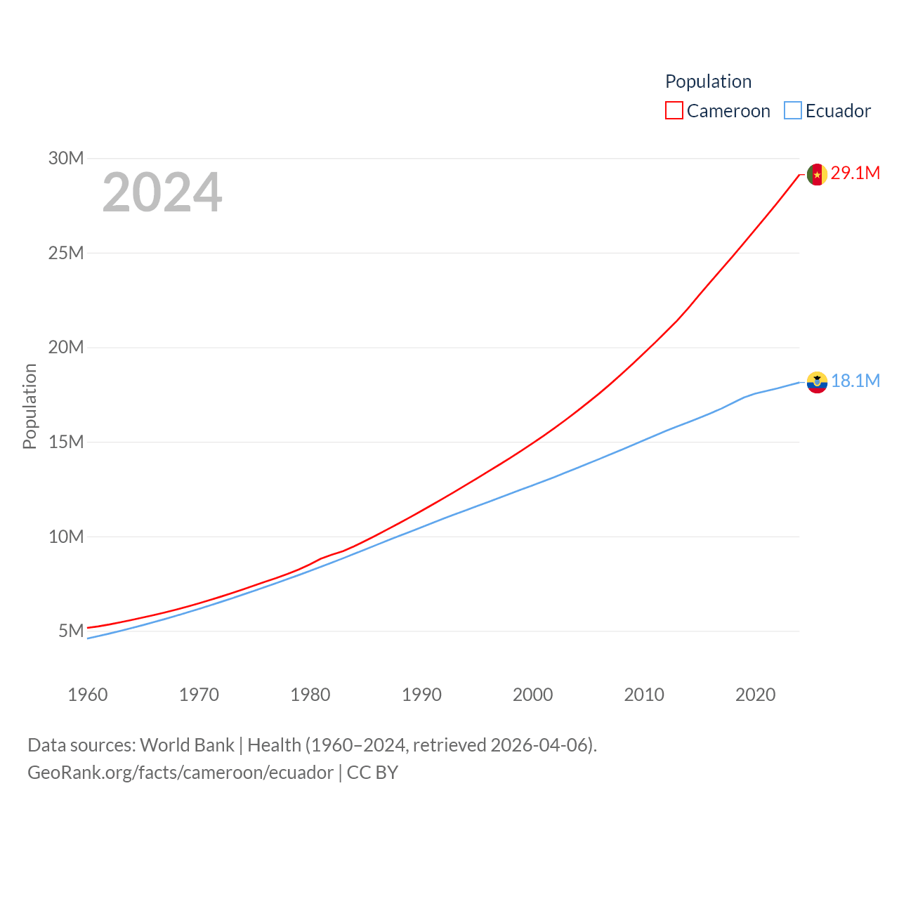 Cameroon has a population of 29.1M (ranked 52/197), compared with 18.1M in Ecuador (ranked 71/197). Cameroon's land area is 182,514 sq mi versus 95,892 sq mi for Ecuador (ranked 52nd vs. 76th).