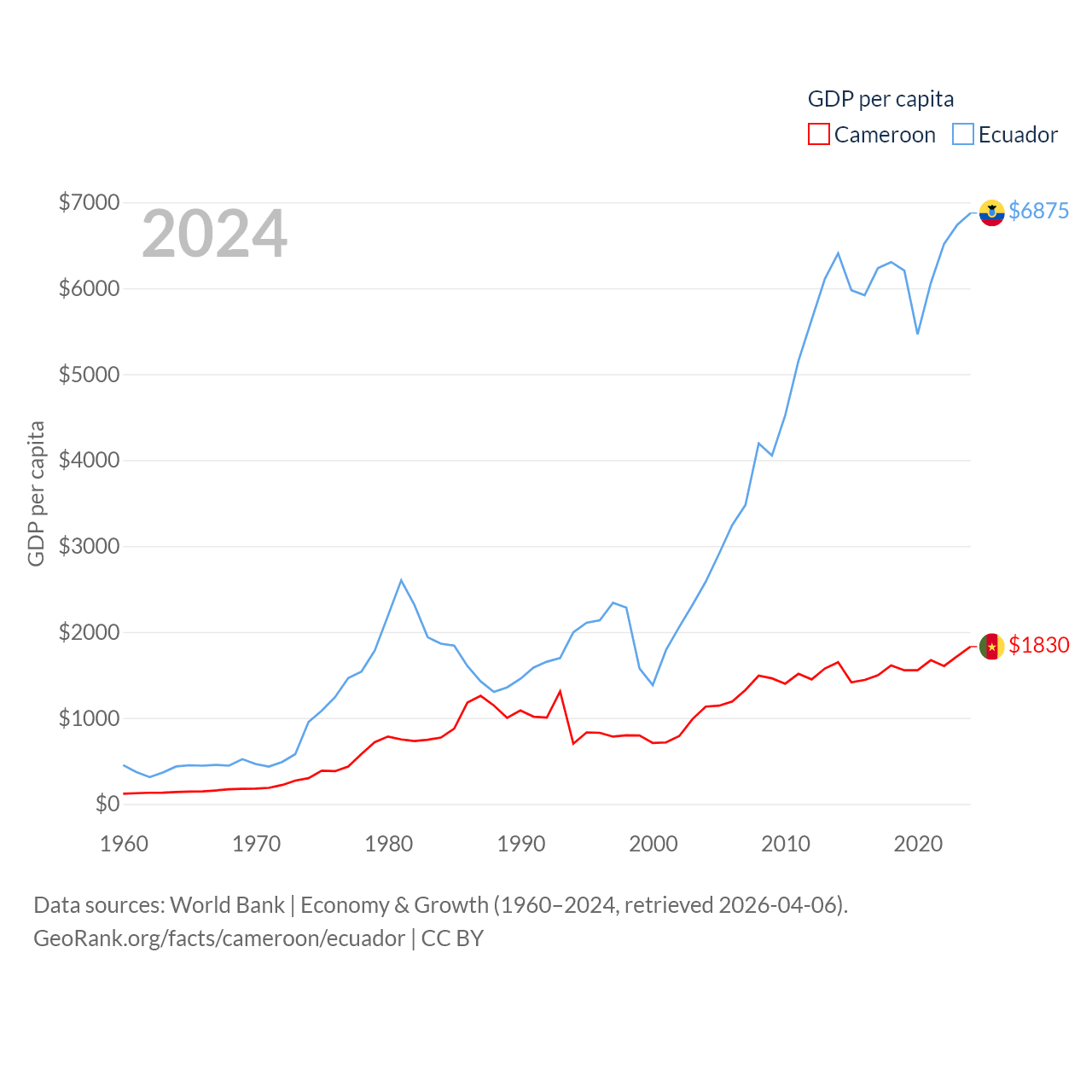 By GDP, Cameroon ranks 91/197 ($53.3B) and Ecuador ranks 62/197 ($125B). By GDP per capita, Cameroon ranks 158/197 ($1,830), while Ecuador ranks 103/197 ($6,875).