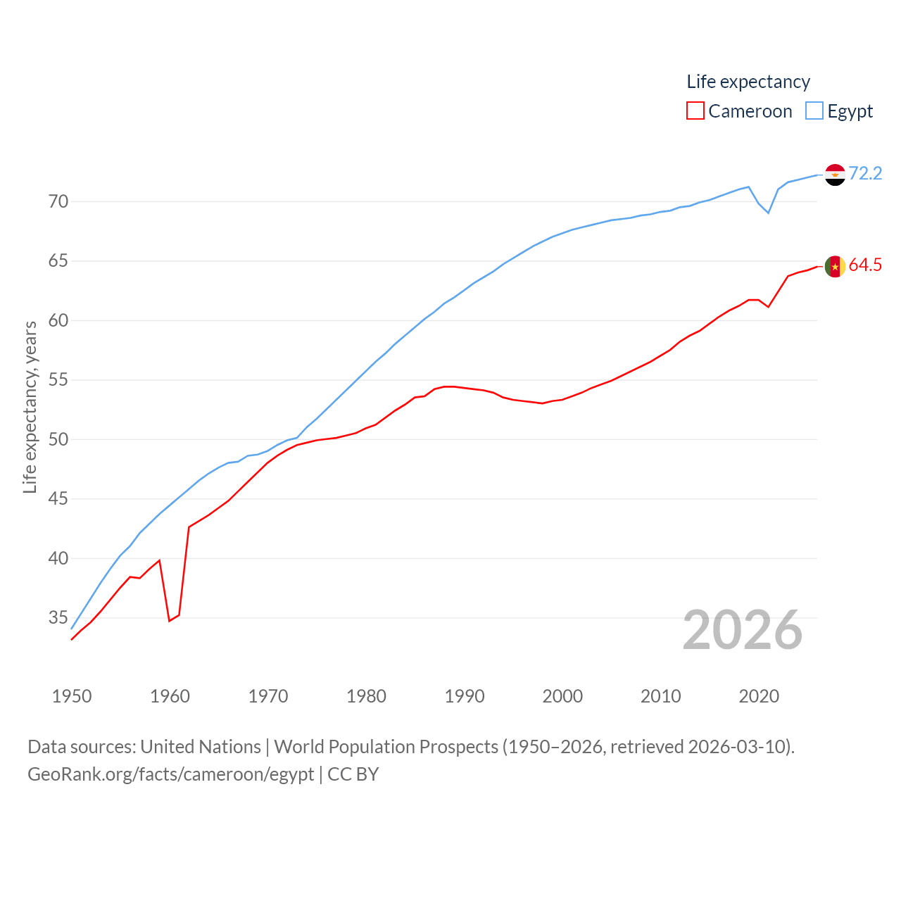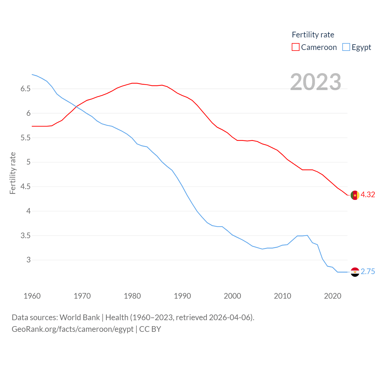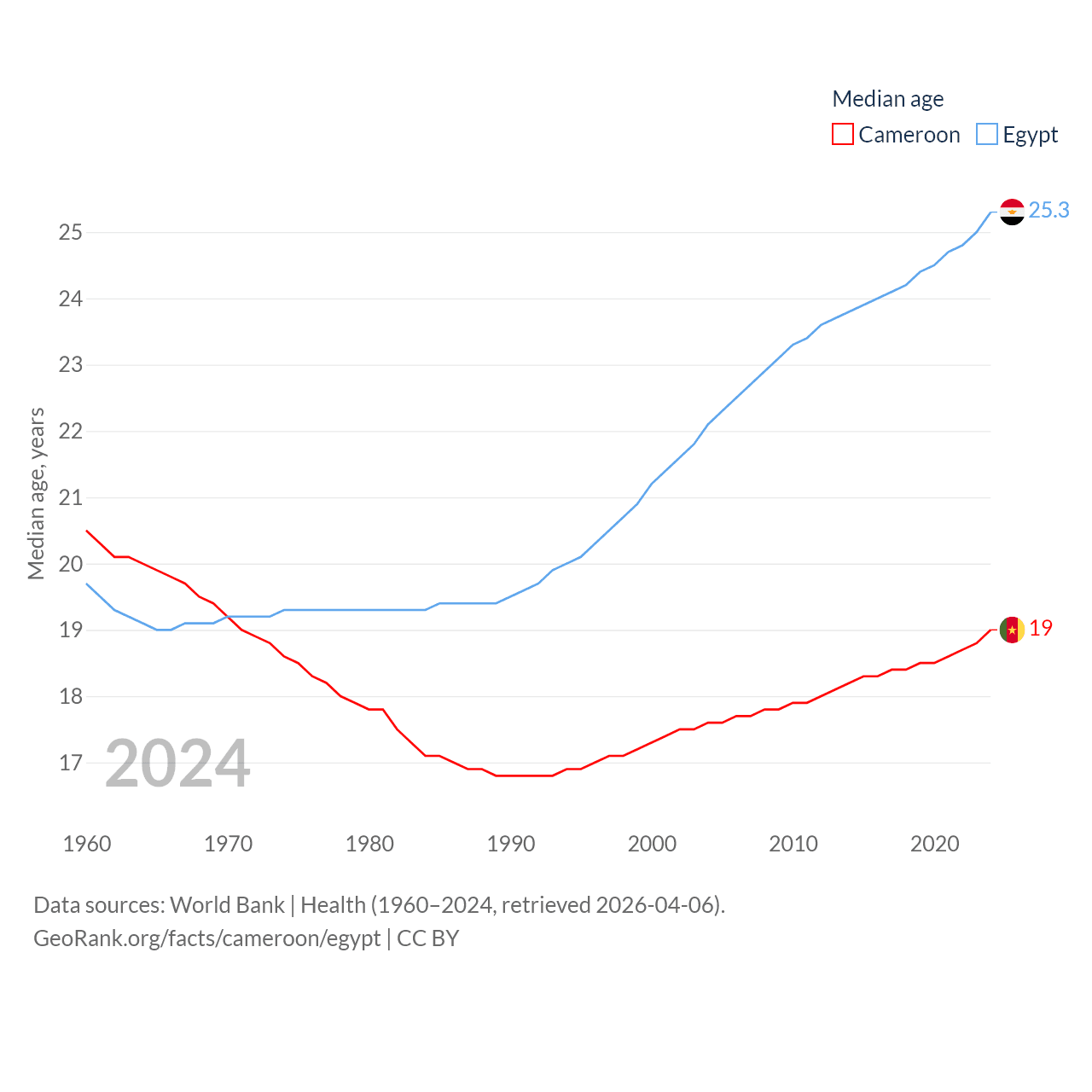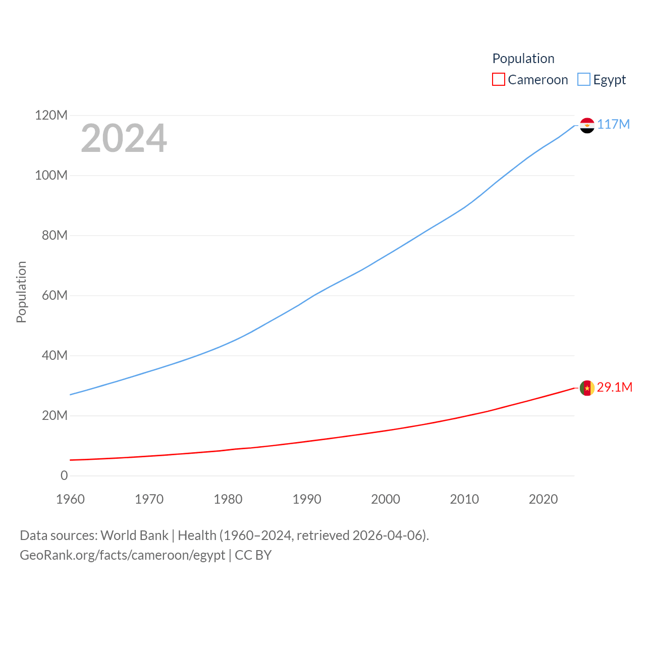 Cameroon has a population of 29.1M (ranked 52/197), compared with 117M in Egypt (ranked 13/197). Cameroon's land area is 182,514 sq mi versus 384,345 sq mi for Egypt (ranked 52nd vs. 29th).