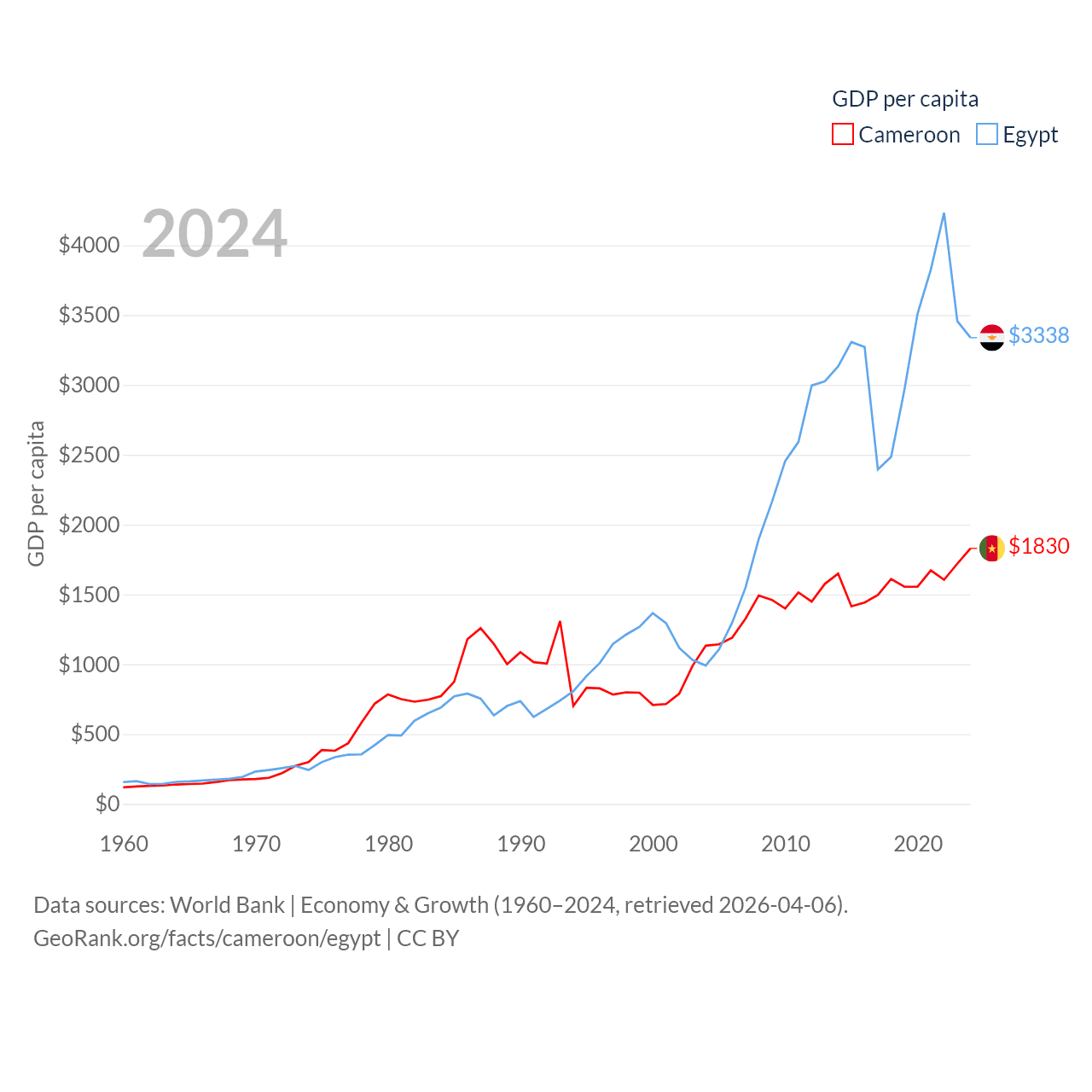 By GDP, Cameroon ranks 91/197 ($53.3B) and Egypt ranks 41/197 ($389B). By GDP per capita, Cameroon ranks 158/197 ($1,830), while Egypt ranks 138/197 ($3,338).