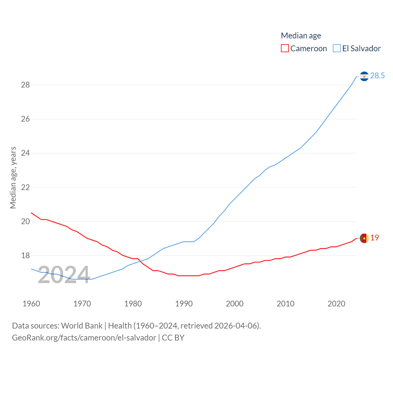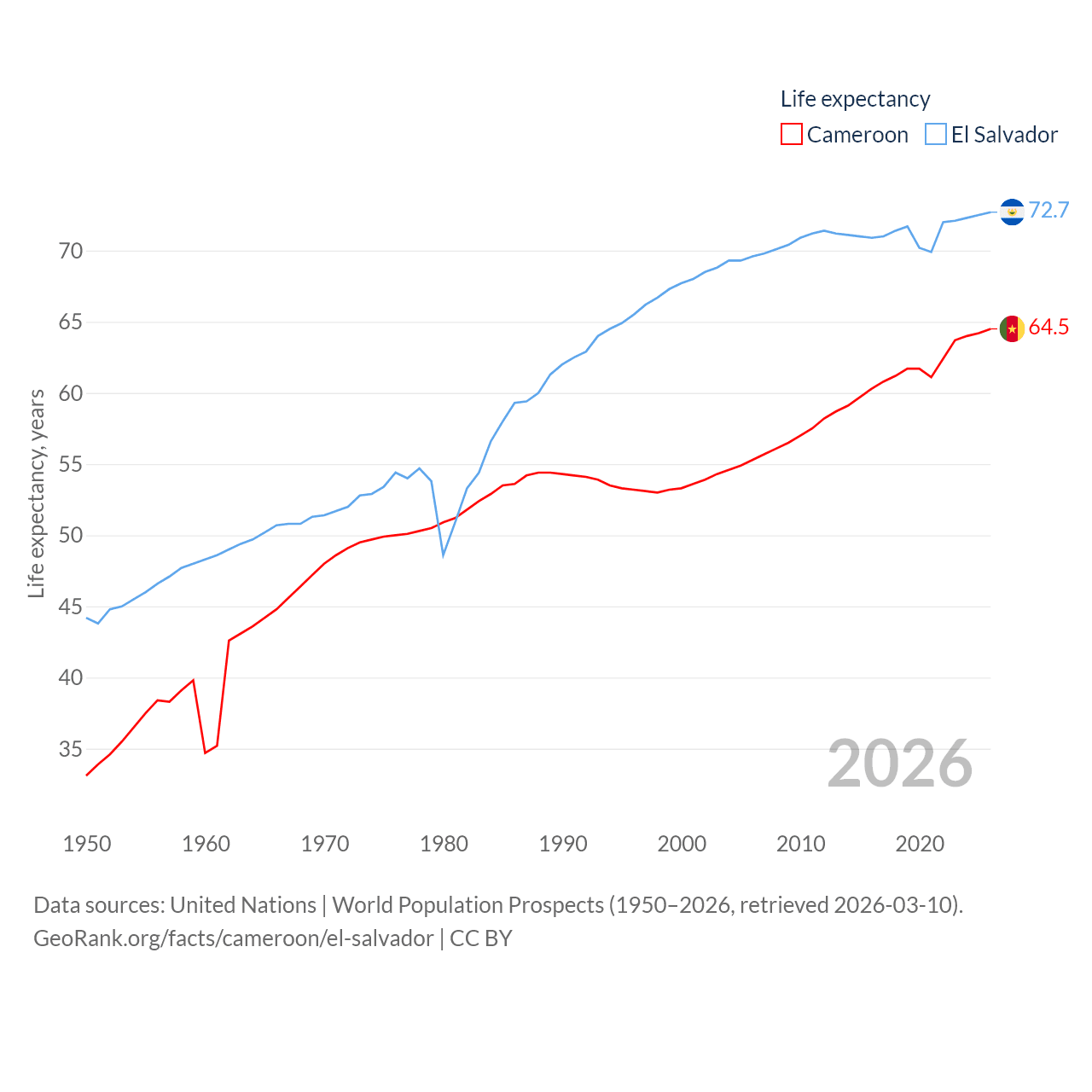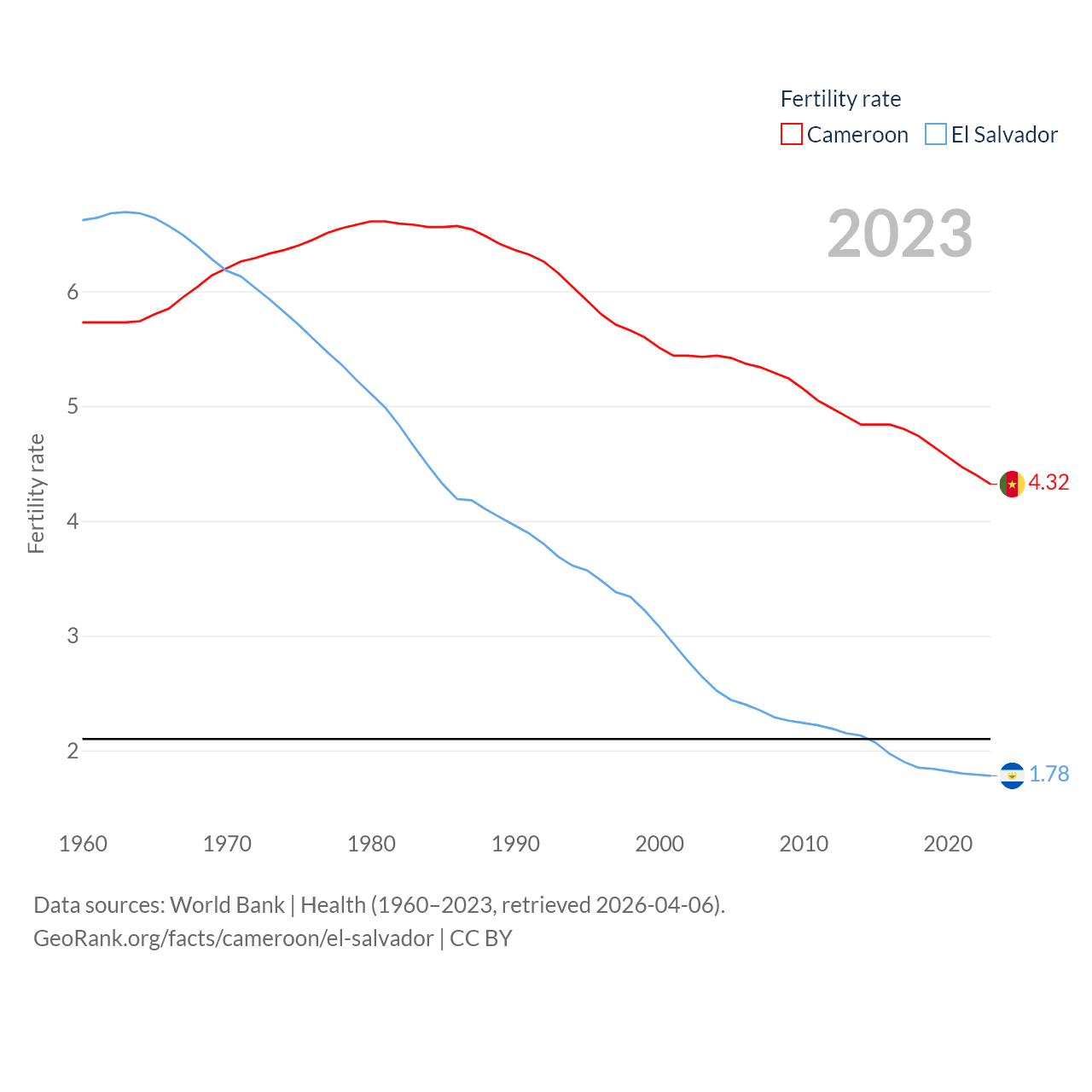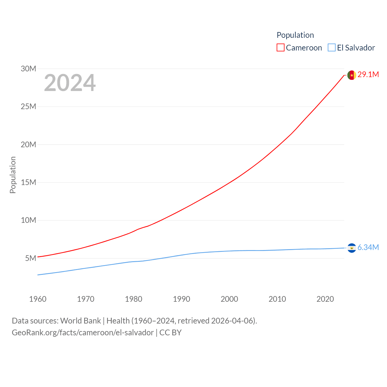 Cameroon has a population of 29.1M (ranked 52/197), compared with 6.34M in El Salvador (ranked 111/197). Cameroon's land area is 182,514 sq mi versus 8,000 sq mi for El Salvador (ranked 52nd vs. 150th).