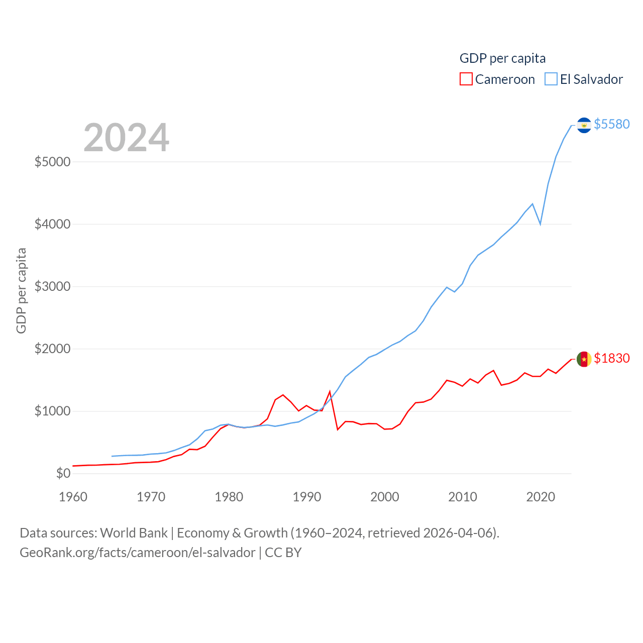 By GDP, Cameroon ranks 91/197 ($53.3B) and El Salvador ranks 105/197 ($35.4B). By GDP per capita, Cameroon ranks 158/197 ($1,830), while El Salvador ranks 116/197 ($5,580).