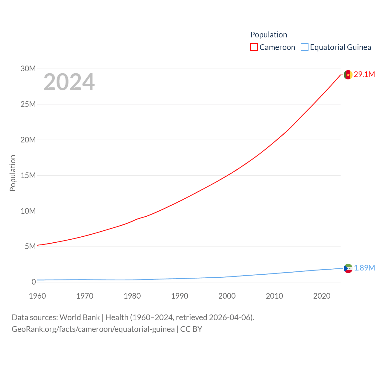 Cameroon has a population of 29.1M (ranked 52/197), compared with 1.89M in Equatorial Guinea (ranked 148/197). Cameroon's land area is 182,514 sq mi versus 10,830 sq mi for Equatorial Guinea (ranked 52nd vs. 140th).