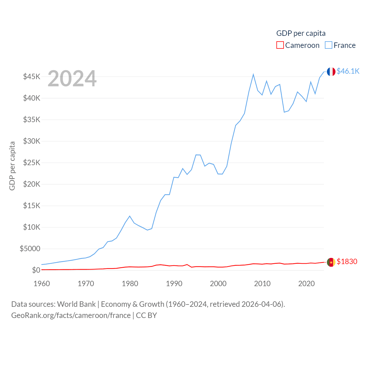 By GDP, Cameroon ranks 91/197 ($53.3B) and France ranks 7/197 ($3.16T). By GDP per capita, Cameroon ranks 158/197 ($1,830), while France ranks 27/197 ($46,103).