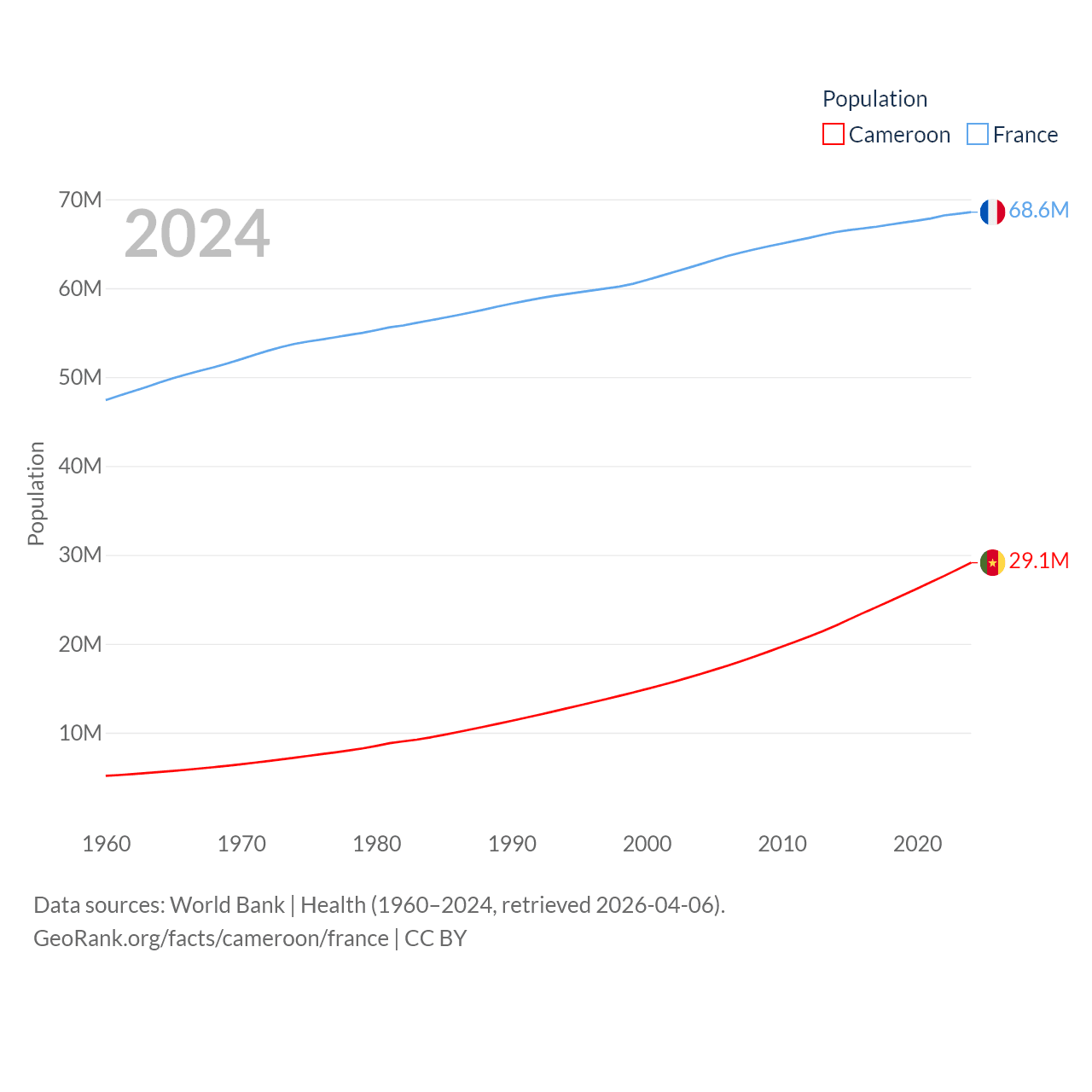 Cameroon has a population of 29.1M (ranked 52/197), compared with 68.6M in France (ranked 23/197). Cameroon's land area is 182,514 sq mi versus 208,090 sq mi for France (ranked 52nd vs. 48th).
