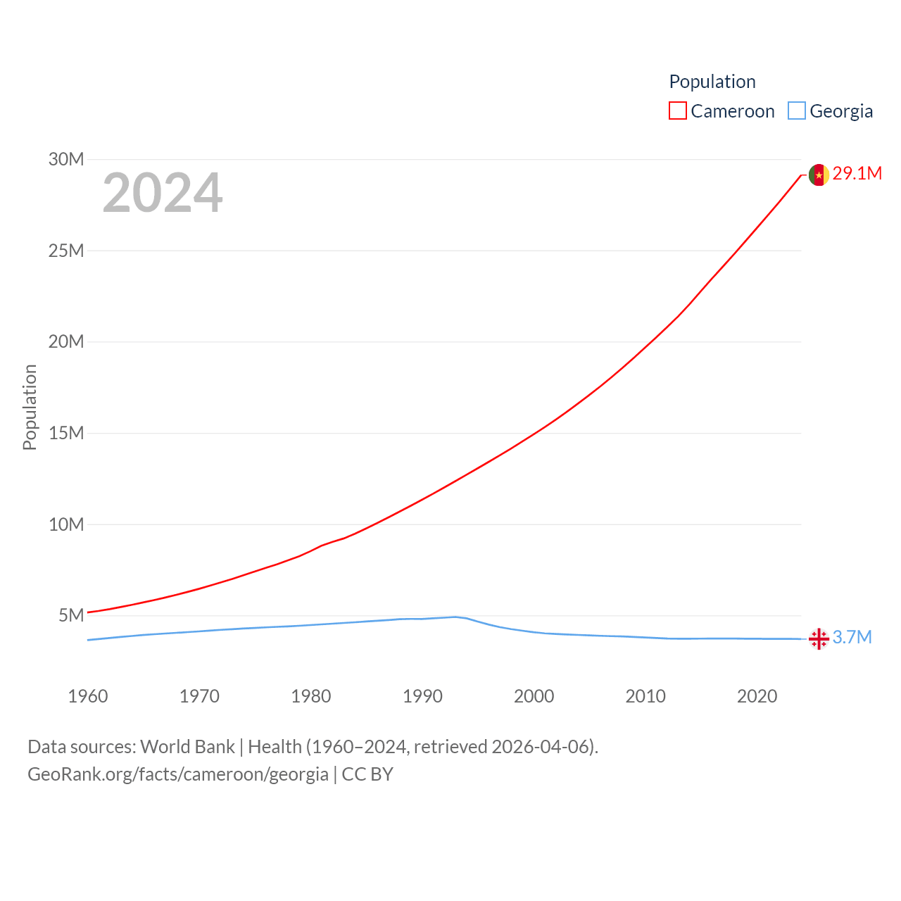 Cameroon has a population of 29.1M (ranked 52/197), compared with 3.7M in Georgia (ranked 130/197). Cameroon's land area is 182,514 sq mi versus 26,830 sq mi for Georgia (ranked 52nd vs. 118th).