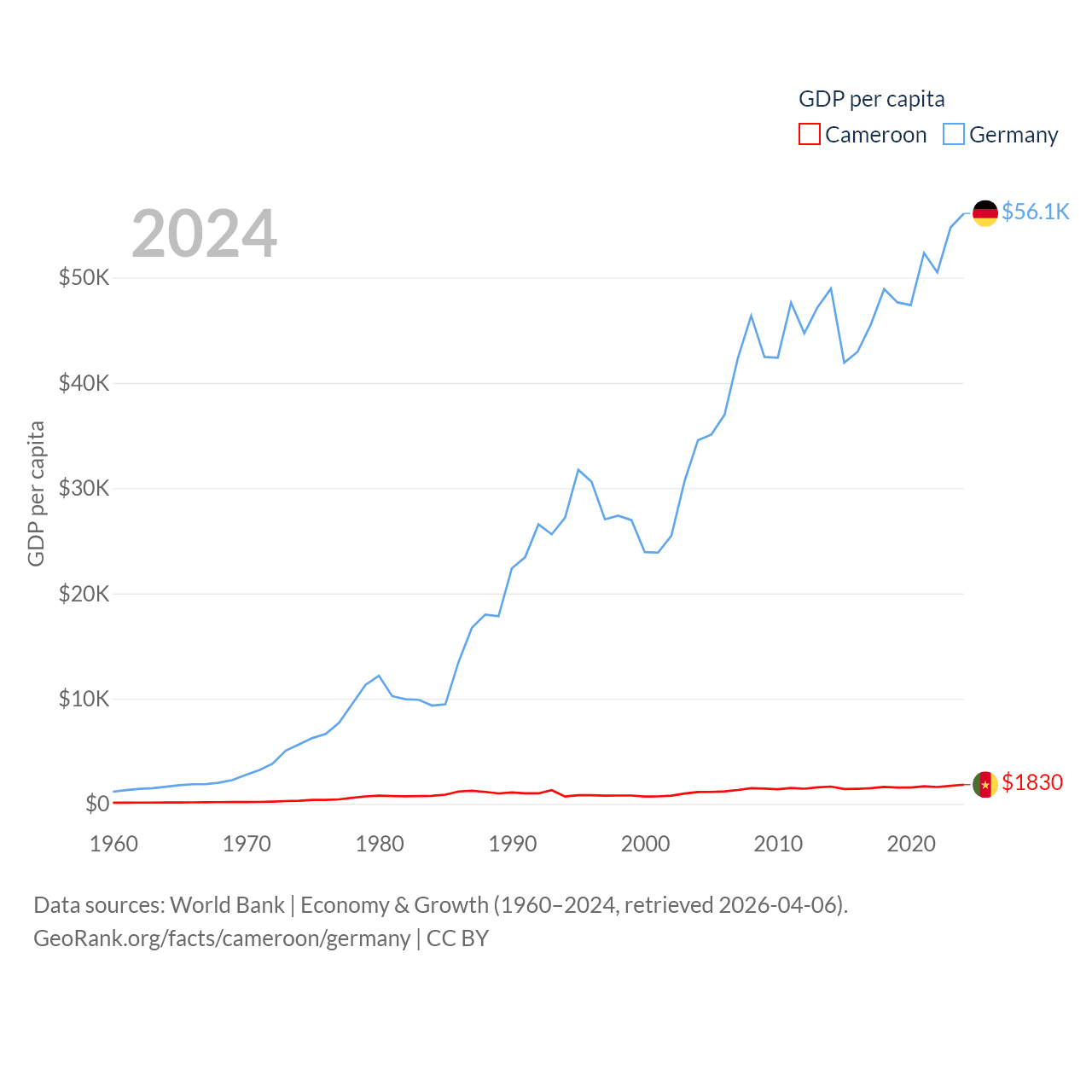 By GDP, Cameroon ranks 91/197 ($53.3B) and Germany ranks 3/197 ($4.69T). By GDP per capita, Cameroon ranks 158/197 ($1,830), while Germany ranks 19/197 ($56,104).