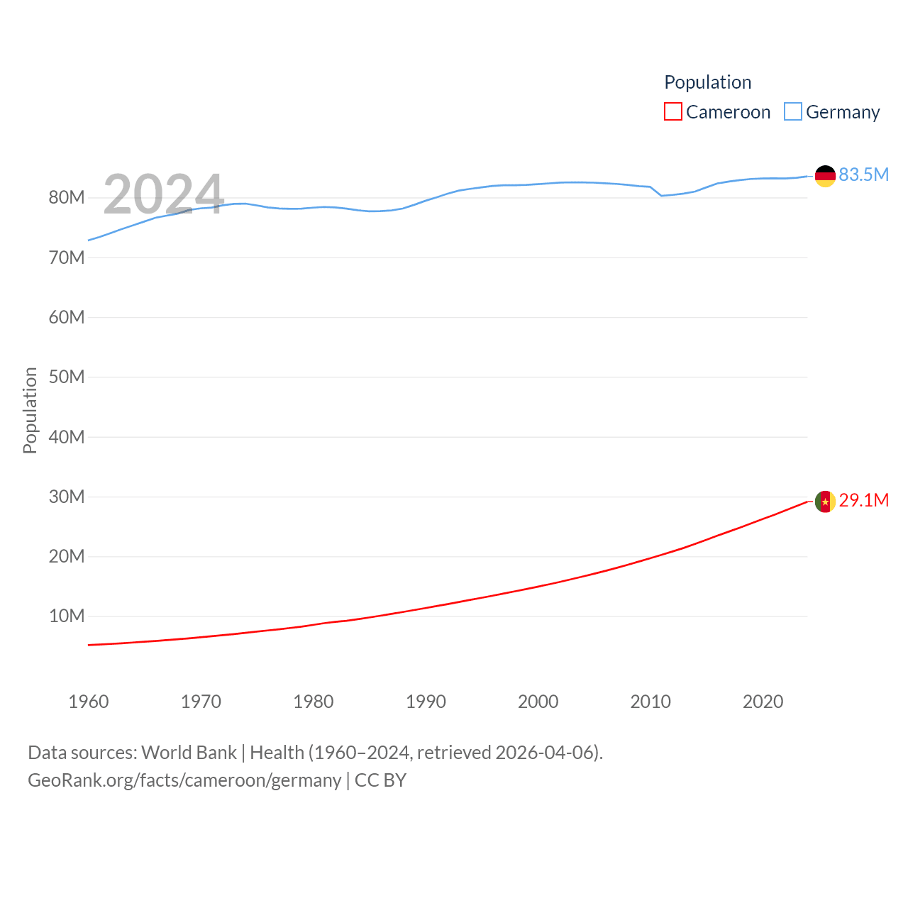 Cameroon has a population of 29.1M (ranked 52/197), compared with 83.5M in Germany (ranked 19/197). Cameroon's land area is 182,514 sq mi versus 134,916 sq mi for Germany (ranked 52nd vs. 63rd).