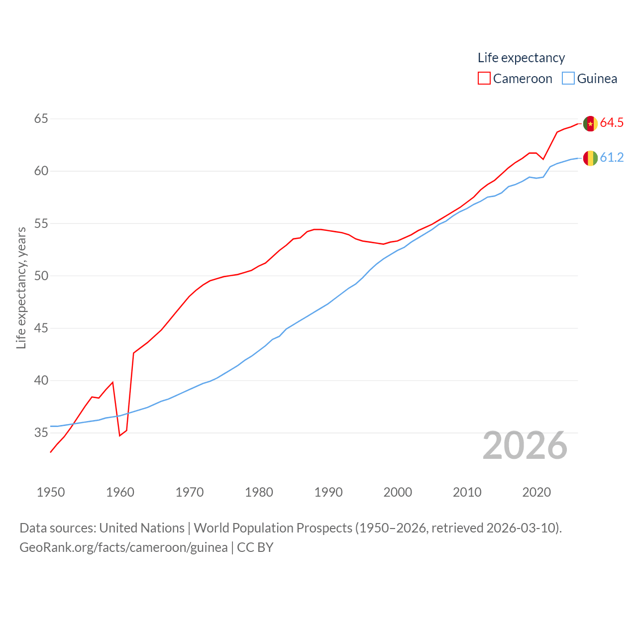 Cameroon has a population of 29.1M (ranked 52/197), compared with 14.8M in Guinea (ranked 75/197). Cameroon's land area is 182,514 sq mi versus 94,873 sq mi for Guinea (ranked 52nd vs. 77th).