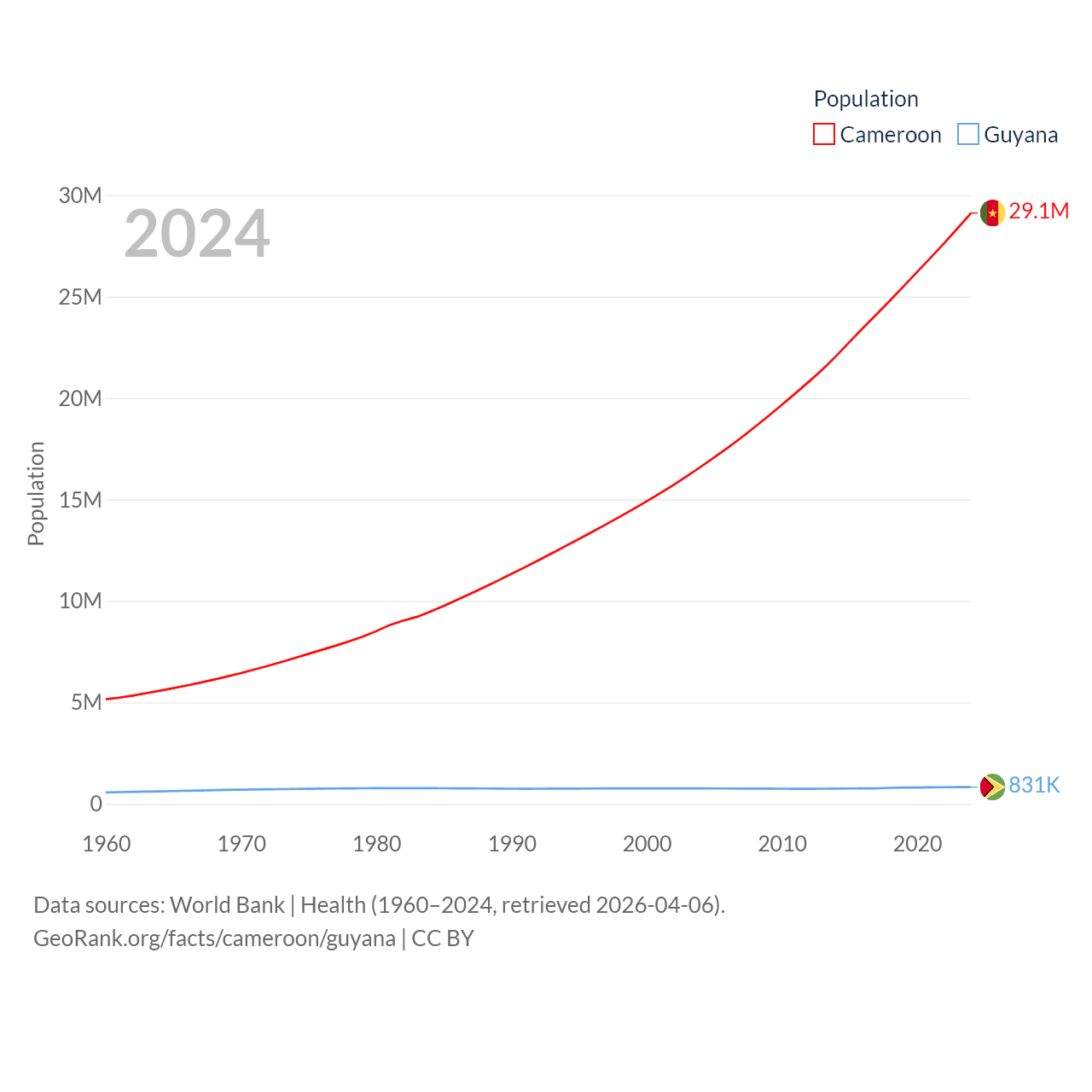 Cameroon has a population of 29.1M (ranked 52/197), compared with 831K in Guyana (ranked 161/197). Cameroon's land area is 182,514 sq mi versus 81,522 sq mi for Guyana (ranked 52nd vs. 82nd).