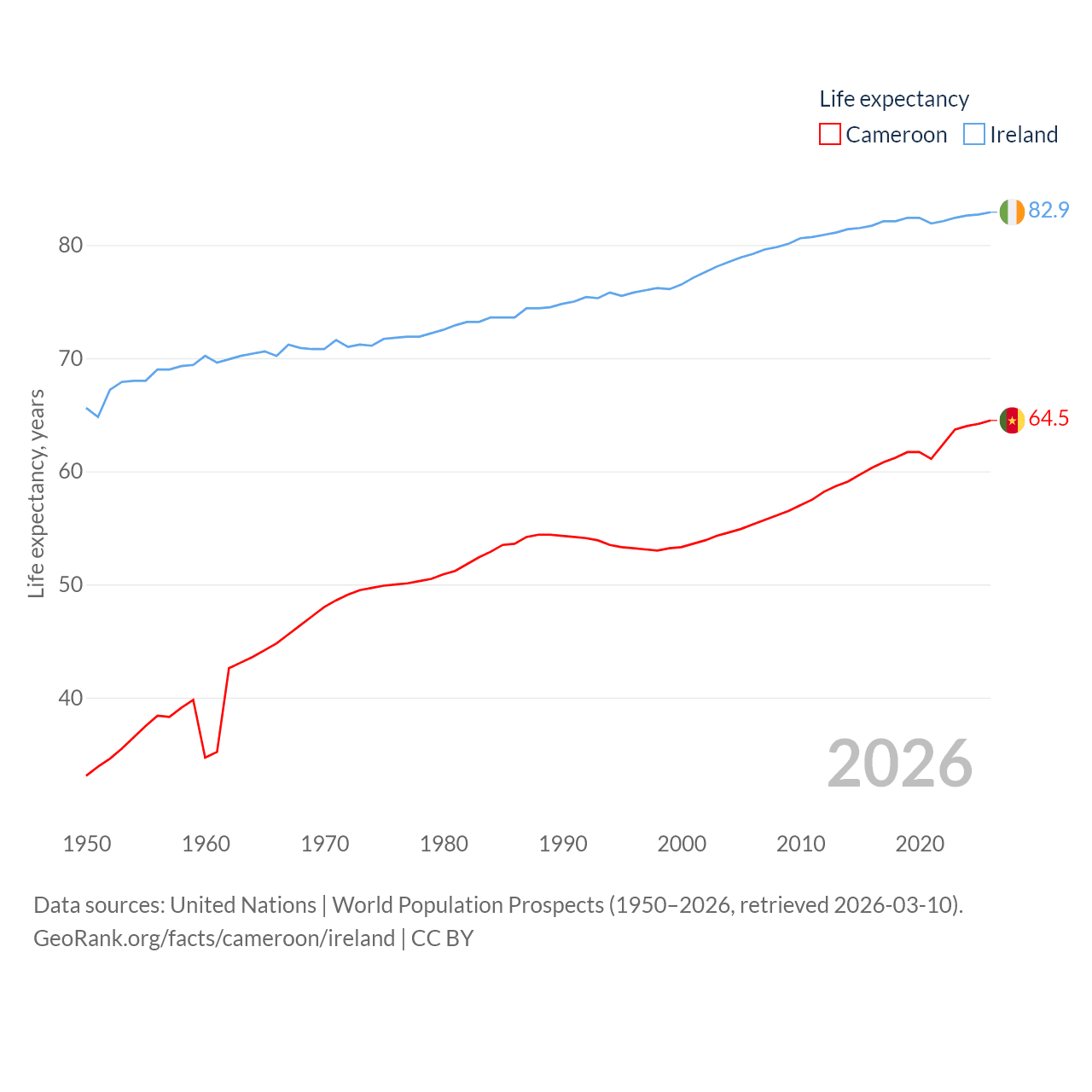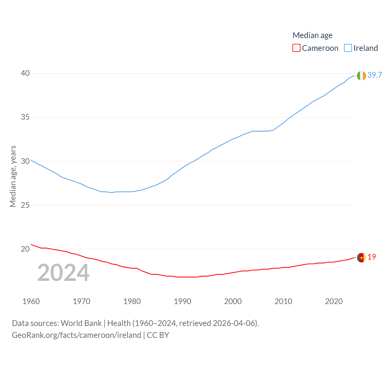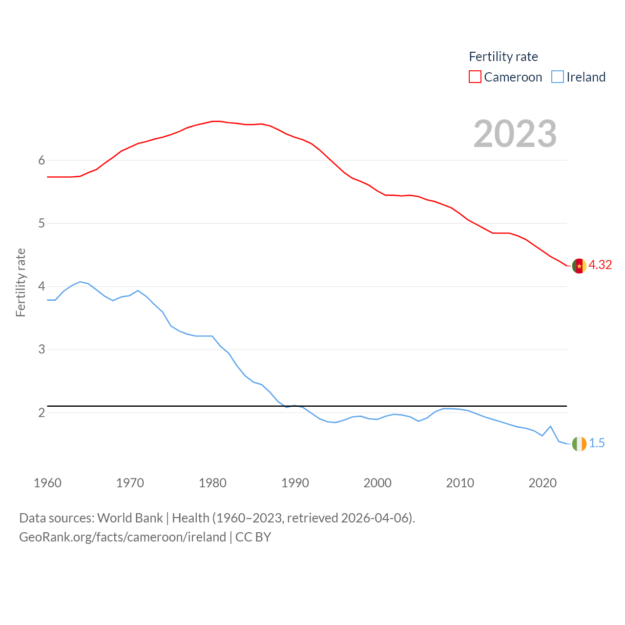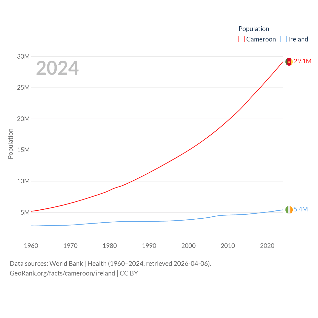 Cameroon has a population of 29.1M (ranked 52/197), compared with 5.4M in Ireland (ranked 120/197). Cameroon's land area is 182,514 sq mi versus 26,599 sq mi for Ireland (ranked 52nd vs. 119th).