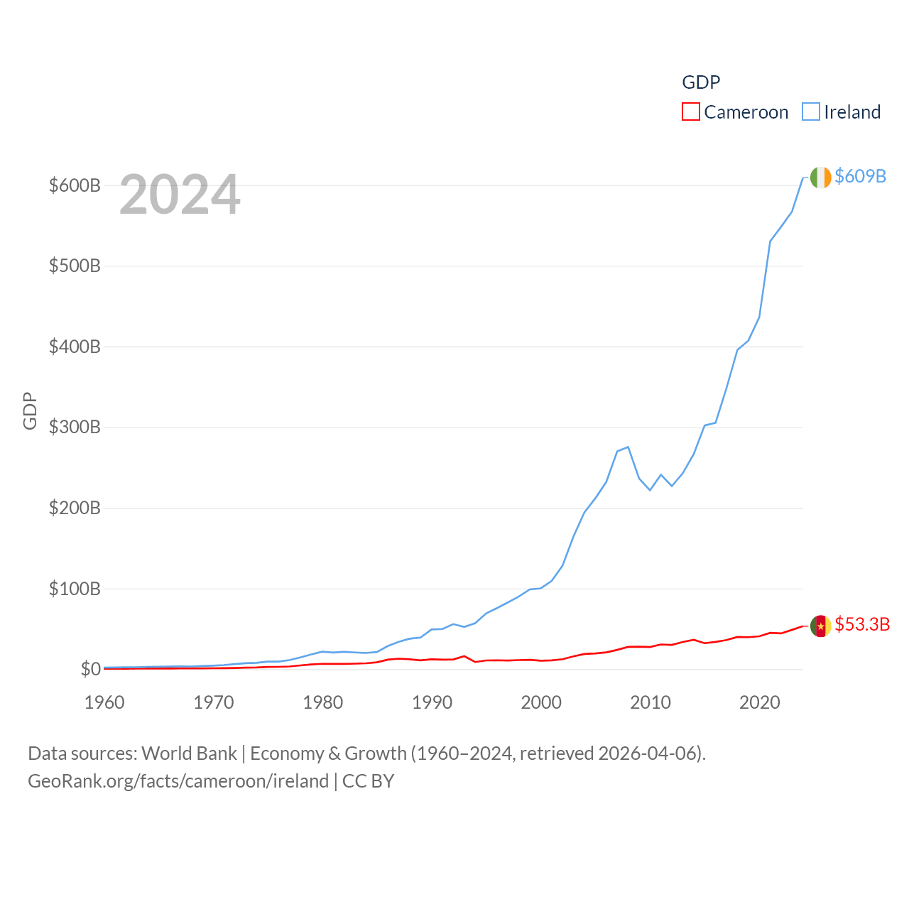 By GDP, Cameroon ranks 91/197 ($53.3B) and Ireland ranks 25/197 ($609B). By GDP per capita, Cameroon ranks 158/197 ($1,830), while Ireland ranks 4/197 ($112,895).