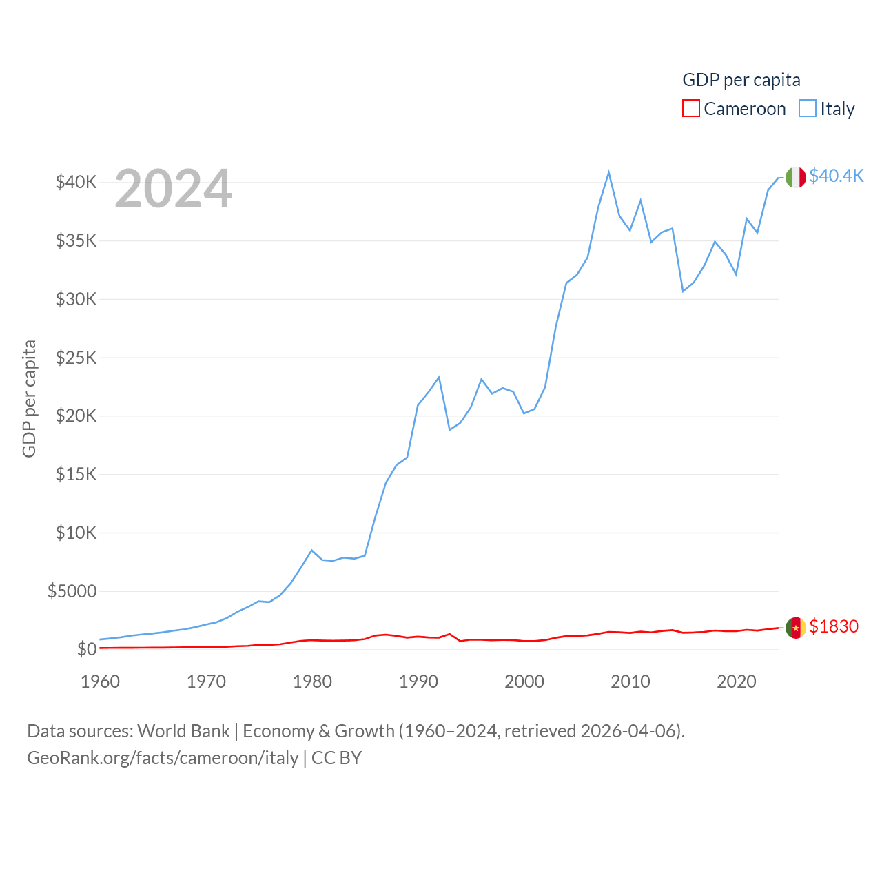 By GDP, Cameroon ranks 91/197 ($53.3B) and Italy ranks 8/197 ($2.38T). By GDP per capita, Cameroon ranks 158/197 ($1,830), while Italy ranks 29/197 ($40,385).