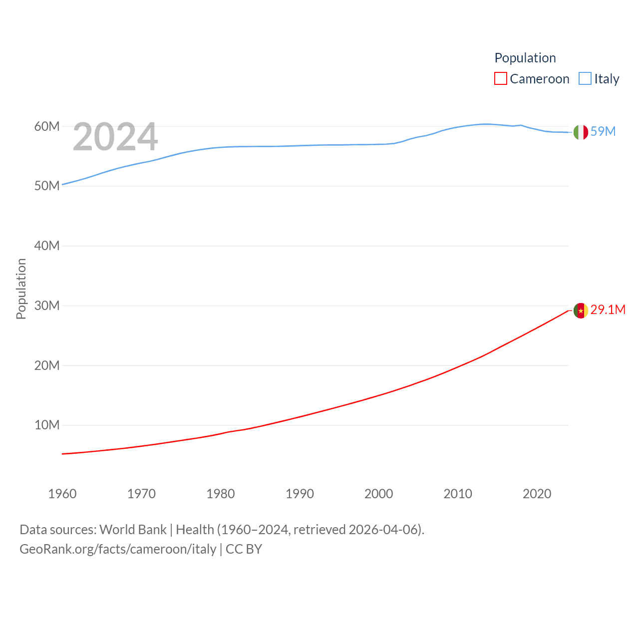 Cameroon has a population of 29.1M (ranked 52/197), compared with 59M in Italy (ranked 25/197). Cameroon's land area is 182,514 sq mi versus 114,178 sq mi for Italy (ranked 52nd vs. 72nd).