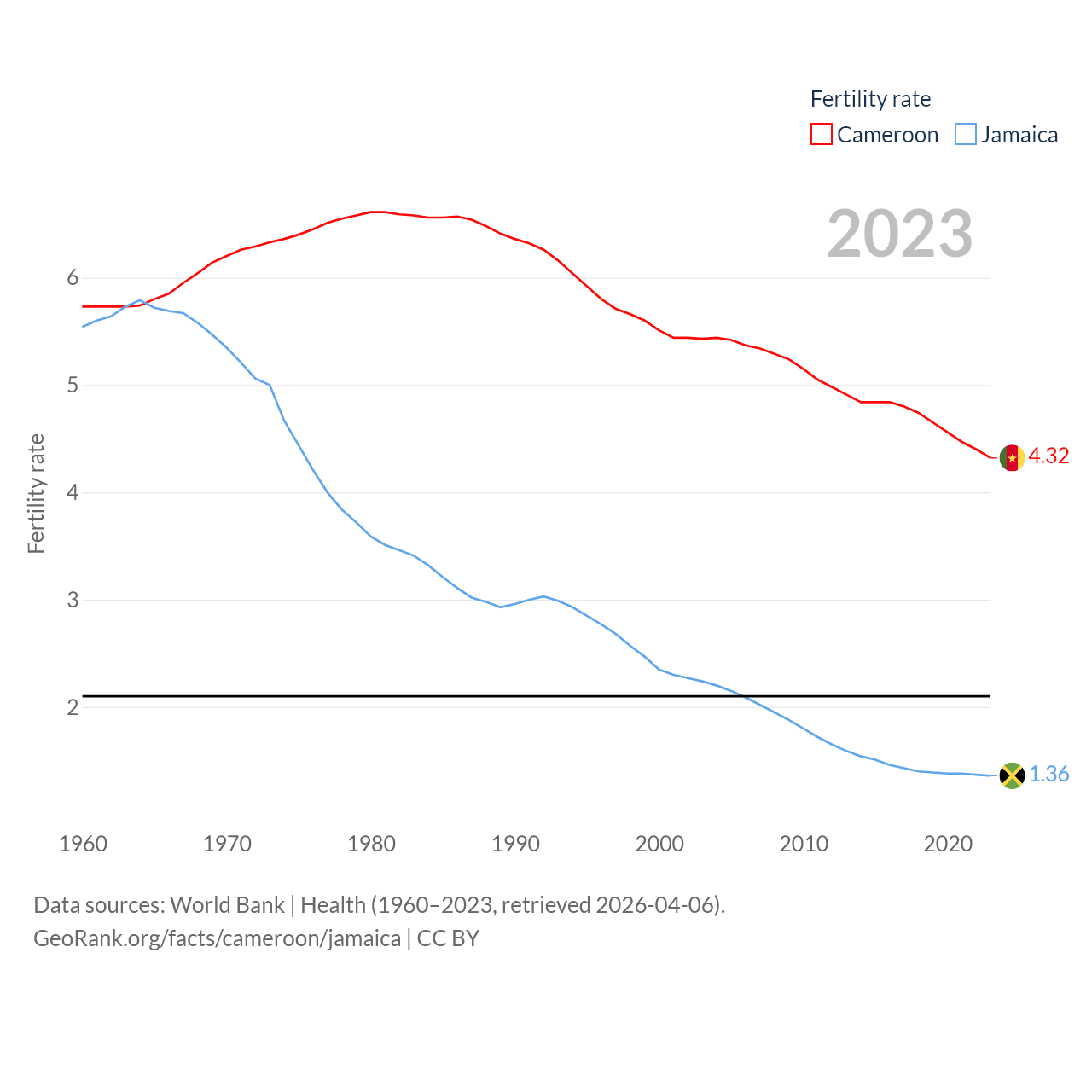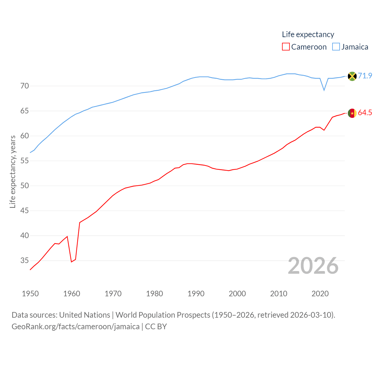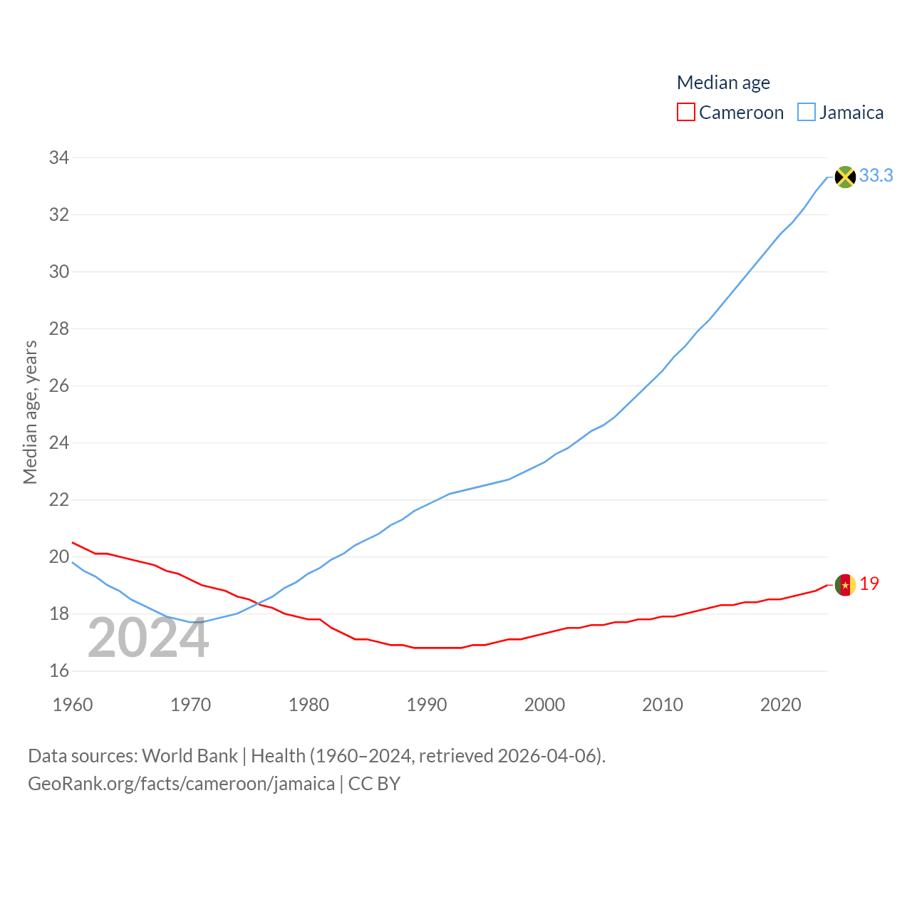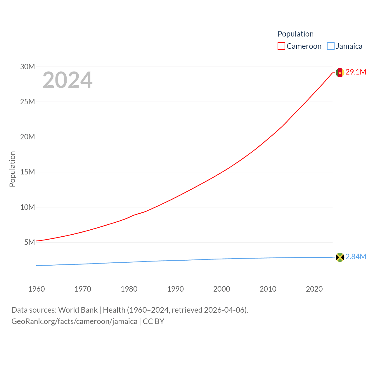 Cameroon has a population of 29.1M (ranked 52/197), compared with 2.84M in Jamaica (ranked 139/197). Cameroon's land area is 182,514 sq mi versus 4,181 sq mi for Jamaica (ranked 52nd vs. 159th).