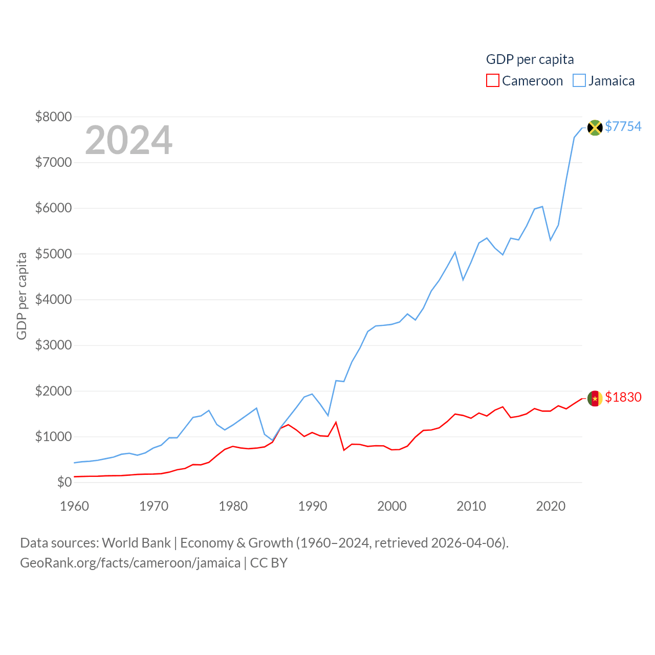 By GDP, Cameroon ranks 91/197 ($53.3B) and Jamaica ranks 124/197 ($22B). By GDP per capita, Cameroon ranks 158/197 ($1,830), while Jamaica ranks 95/197 ($7,754).
