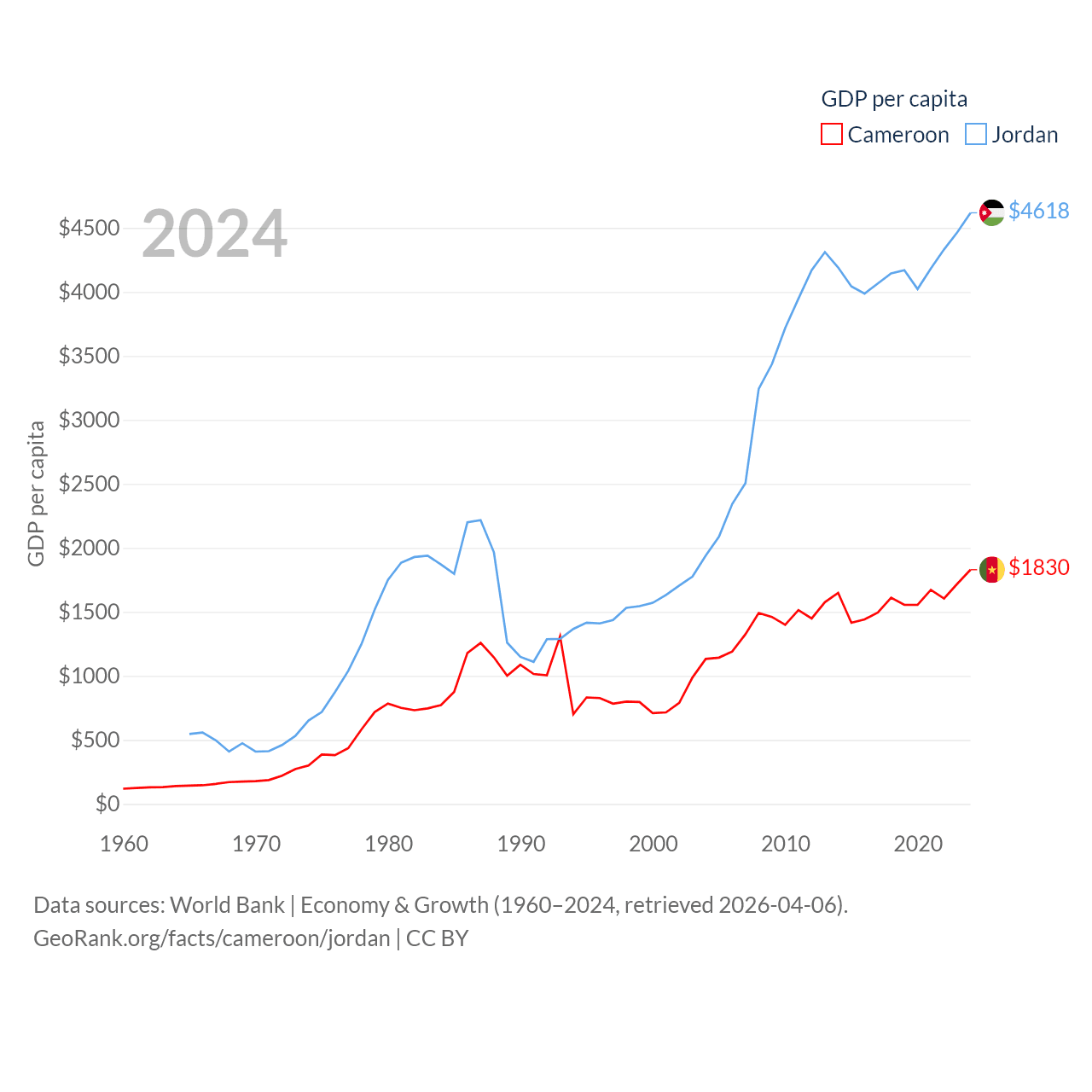 By GDP, Cameroon ranks 91/197 ($53.3B) and Jordan ranks 90/197 ($53.4B). By GDP per capita, Cameroon ranks 158/197 ($1,830), while Jordan ranks 123/197 ($4,618).