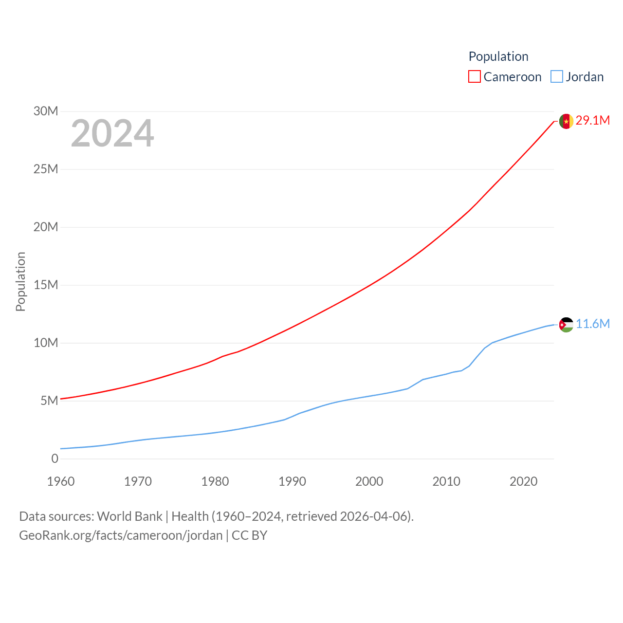 Cameroon has a population of 29.1M (ranked 52/197), compared with 11.6M in Jordan (ranked 84/197). Cameroon's land area is 182,514 sq mi versus 34,284 sq mi for Jordan (ranked 52nd vs. 110th).
