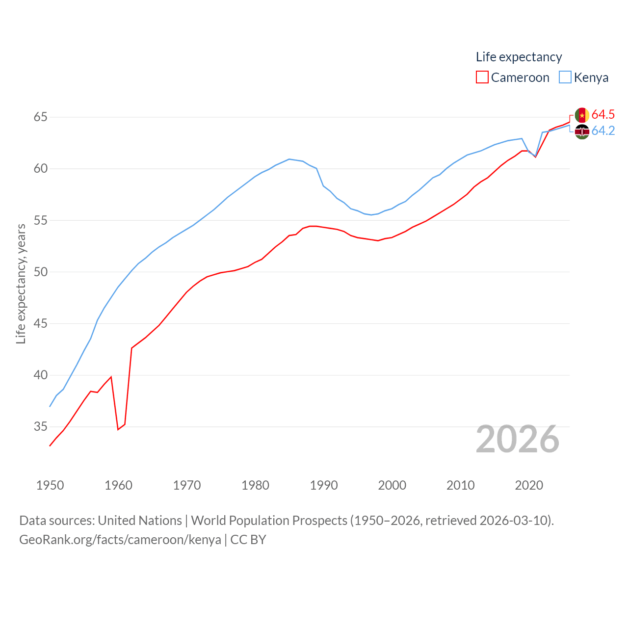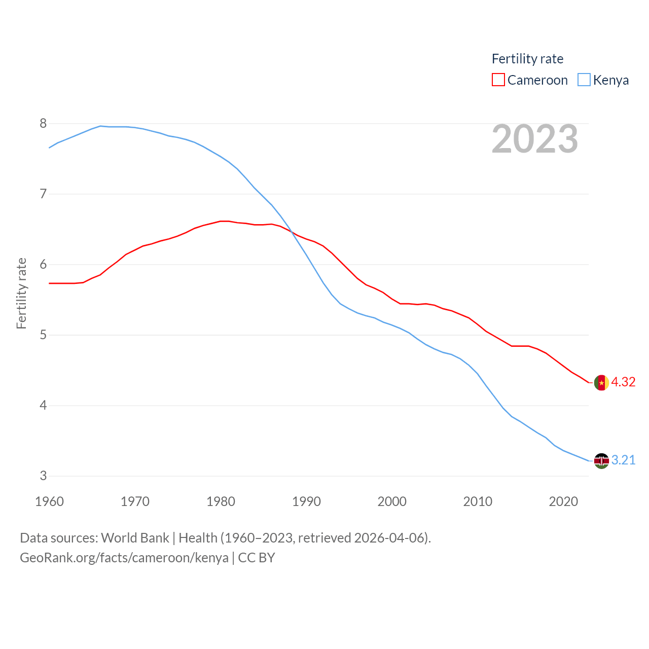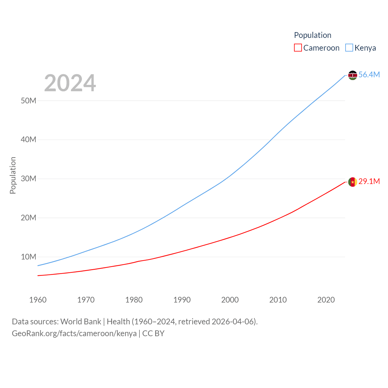 Cameroon has a population of 29.1M (ranked 52/197), compared with 56.4M in Kenya (ranked 26/197). Cameroon's land area is 182,514 sq mi versus 224,278 sq mi for Kenya (ranked 52nd vs. 45th).