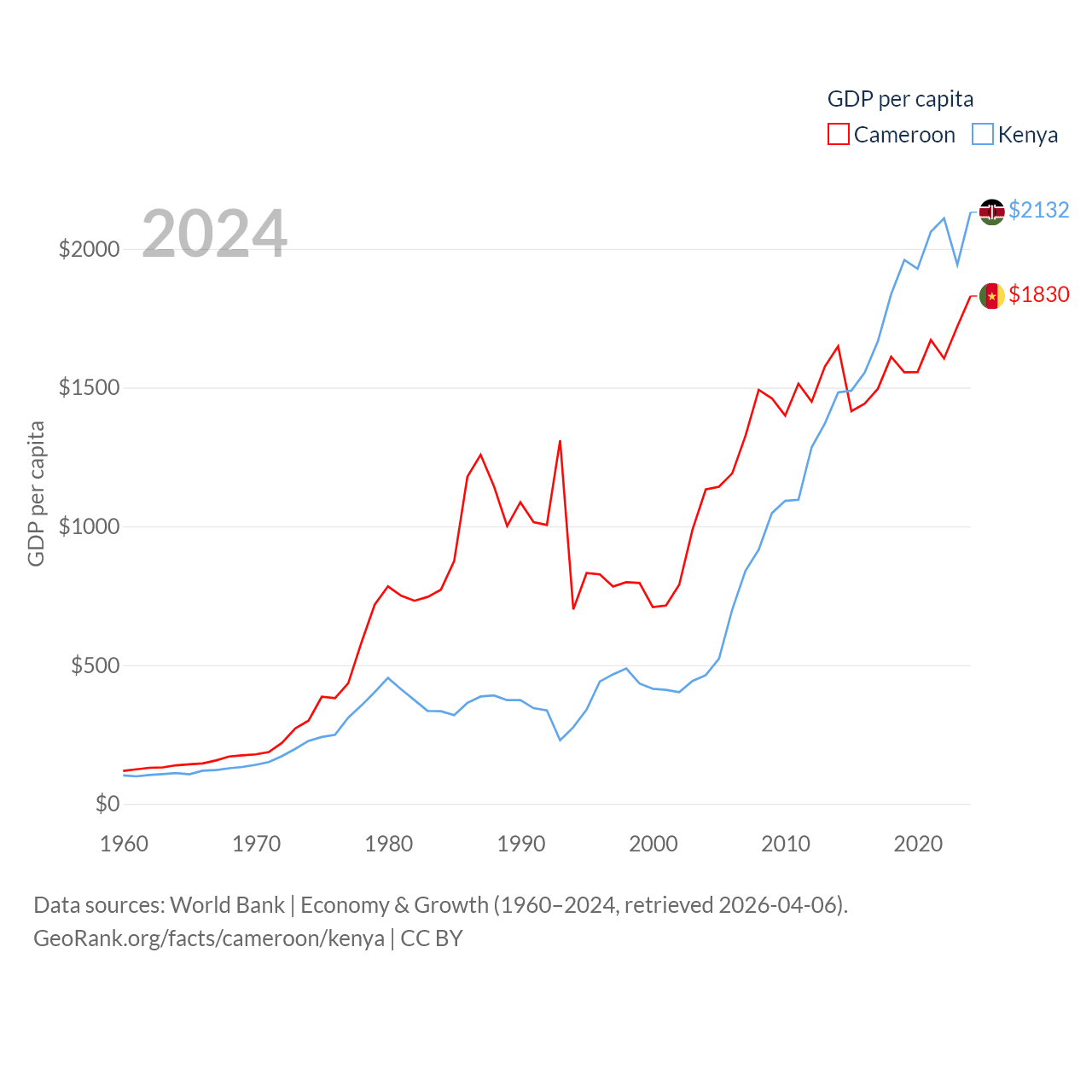 By GDP, Cameroon ranks 91/197 ($53.3B) and Kenya ranks 64/197 ($120B). By GDP per capita, Cameroon ranks 158/197 ($1,830), while Kenya ranks 154/197 ($2,132).