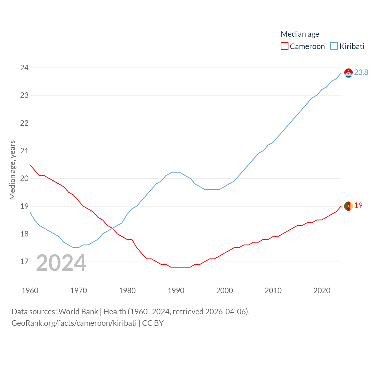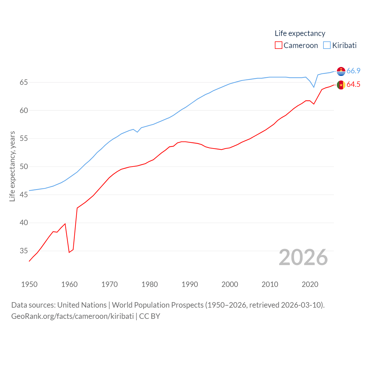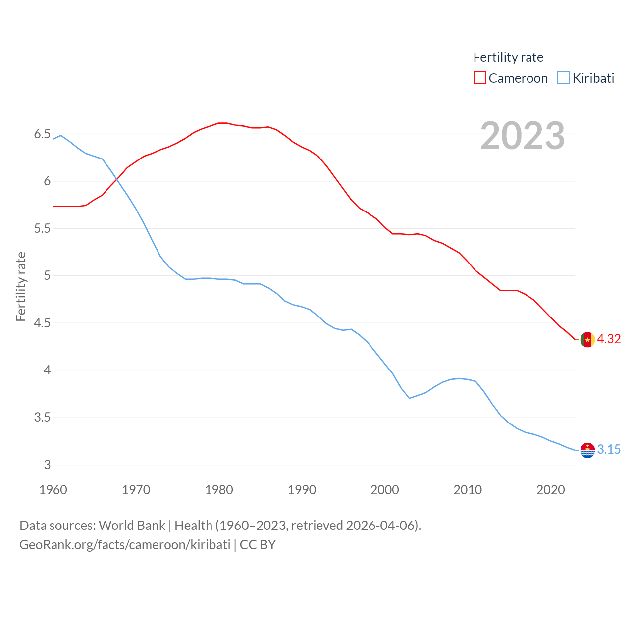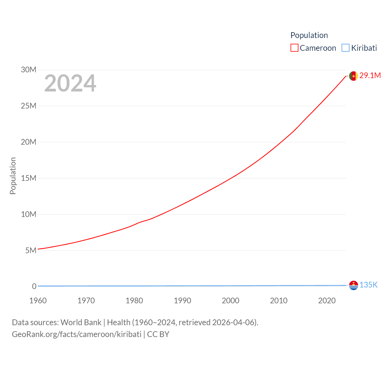 Cameroon has a population of 29.1M (ranked 52/197), compared with 135K in Kiribati (ranked 180/197). Cameroon's land area is 182,514 sq mi versus 313 sq mi for Kiribati (ranked 52nd vs. 173rd).