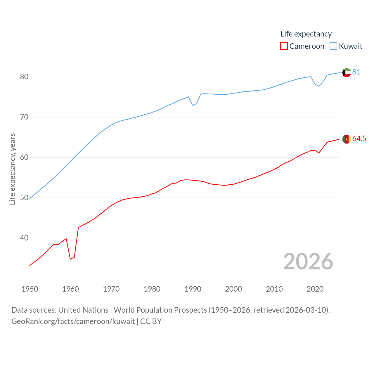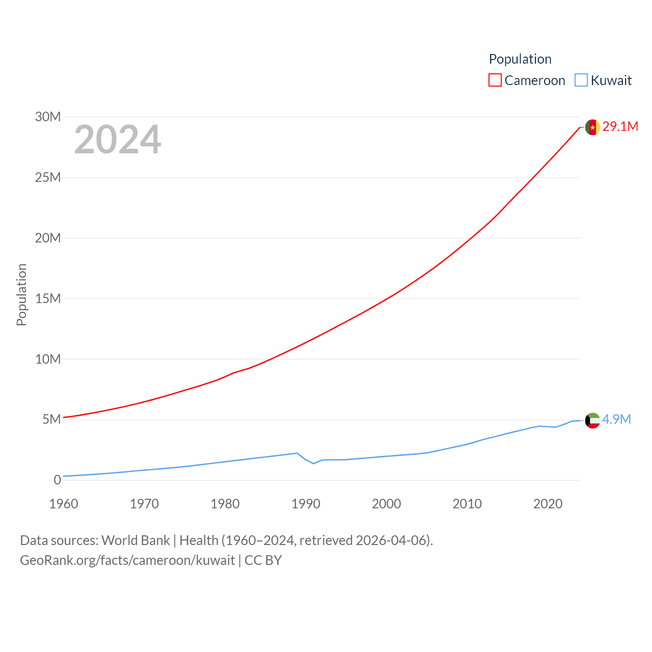 Cameroon has a population of 29.1M (ranked 52/197), compared with 4.9M in Kuwait (ranked 127/197). Cameroon's land area is 182,514 sq mi versus 6,880 sq mi for Kuwait (ranked 52nd vs. 153rd).