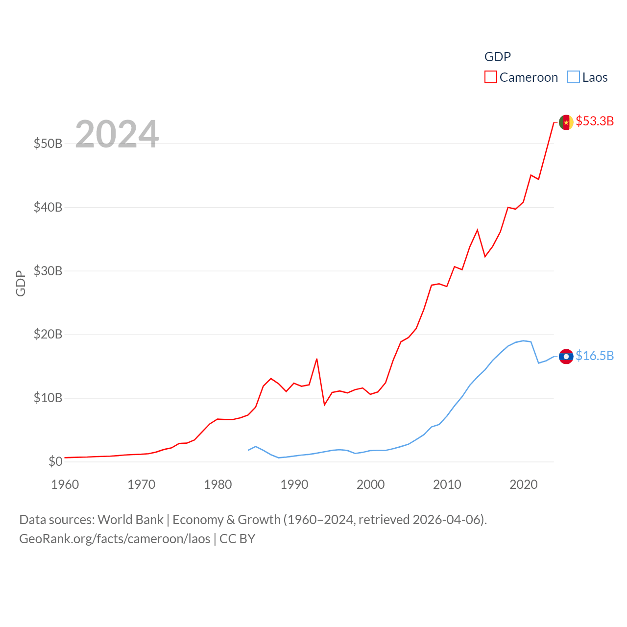 By GDP, Cameroon ranks 91/197 ($53.3B) and Laos ranks 139/197 ($16.5B). By GDP per capita, Cameroon ranks 158/197 ($1,830), while Laos ranks 155/197 ($2,124).