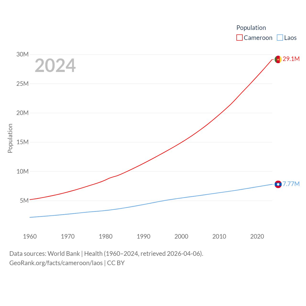 Cameroon has a population of 29.1M (ranked 52/197), compared with 7.77M in Laos (ranked 103/197). Cameroon's land area is 182,514 sq mi versus 89,112 sq mi for Laos (ranked 52nd vs. 79th).