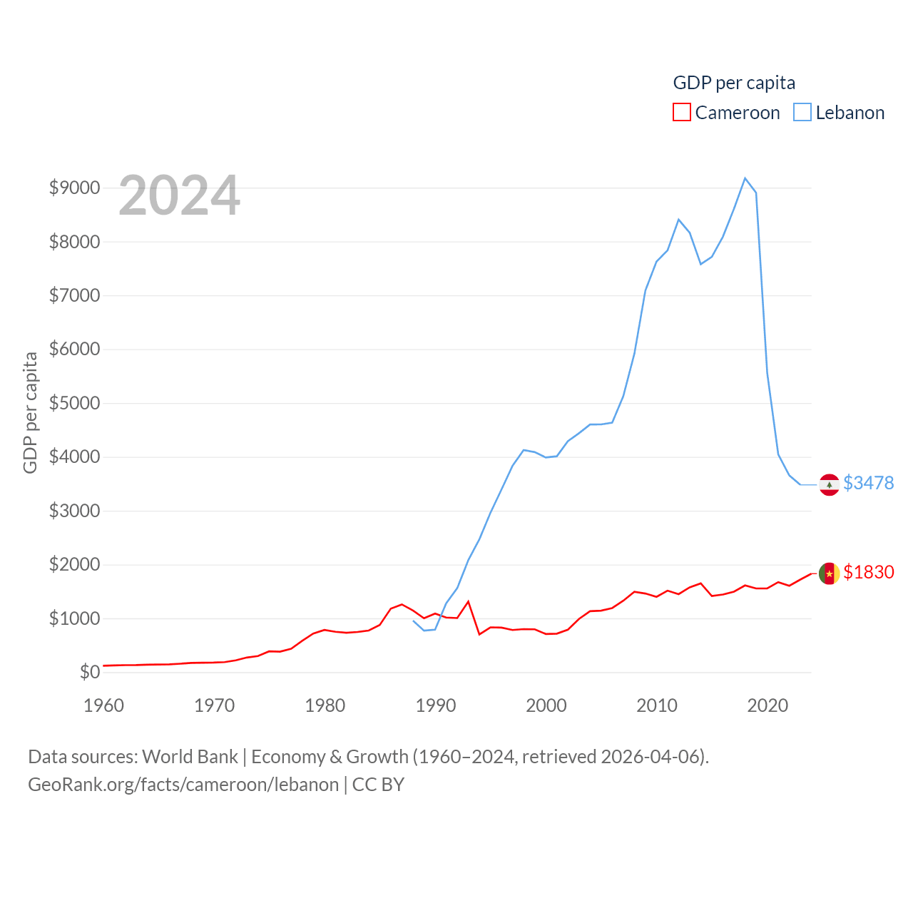 By GDP, Cameroon ranks 91/197 ($53.3B) and Lebanon ranks 128/197 ($20.1B). By GDP per capita, Cameroon ranks 158/197 ($1,830), while Lebanon ranks 135/197 ($3,478).