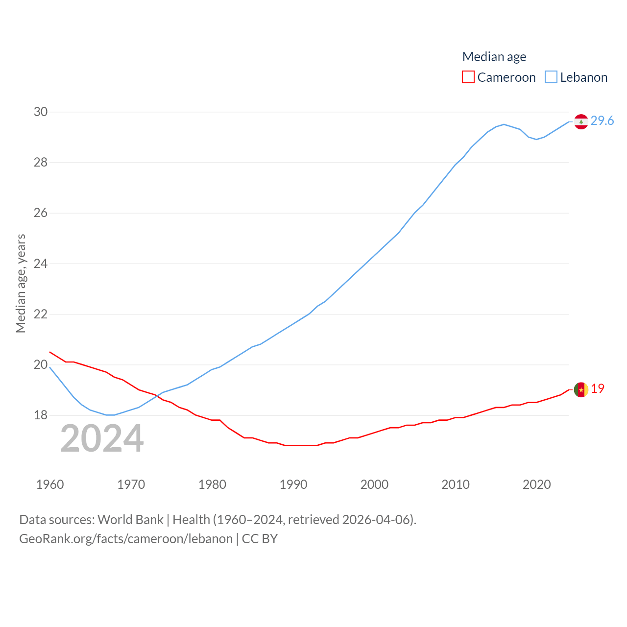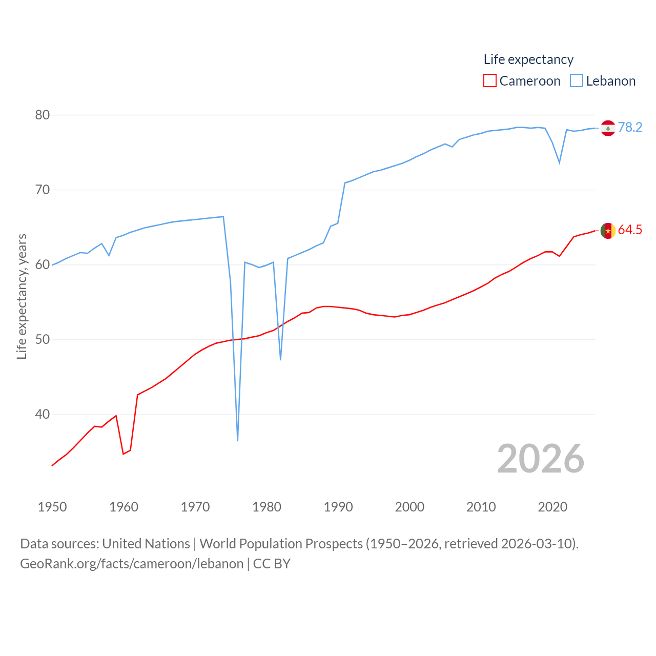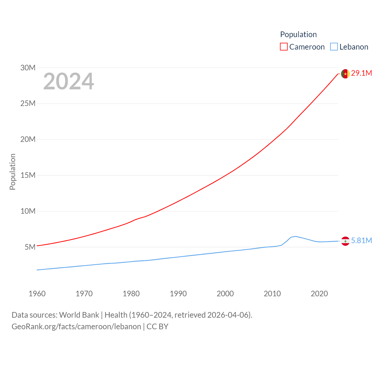Cameroon has a population of 29.1M (ranked 52/197), compared with 5.81M in Lebanon (ranked 115/197). Cameroon's land area is 182,514 sq mi versus 3,950 sq mi for Lebanon (ranked 52nd vs. 160th).