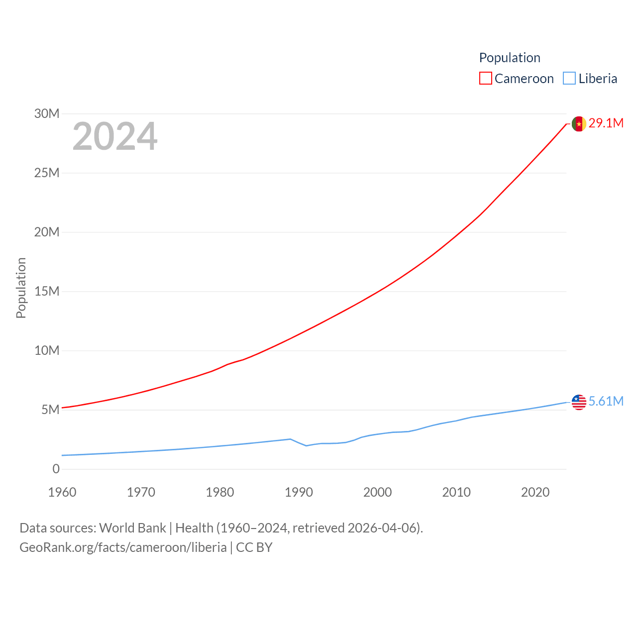 Cameroon has a population of 29.1M (ranked 52/197), compared with 5.61M in Liberia (ranked 117/197). Cameroon's land area is 182,514 sq mi versus 37,189 sq mi for Liberia (ranked 52nd vs. 106th).