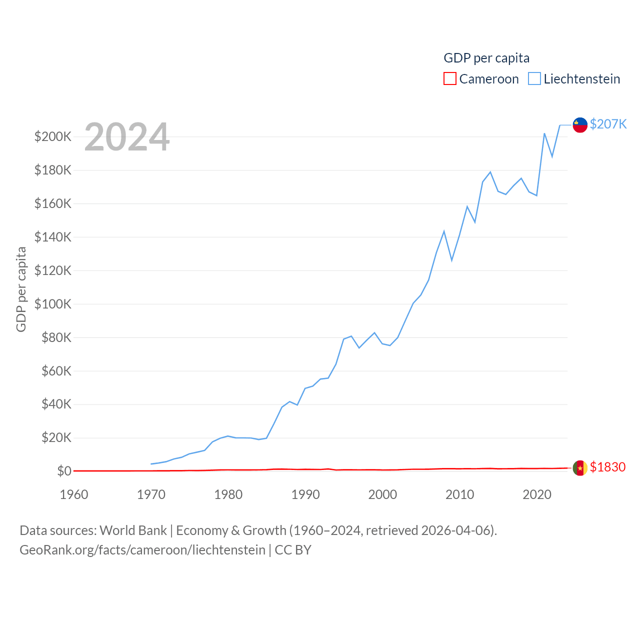 By GDP, Cameroon ranks 91/197 ($53.3B) and Liechtenstein ranks 156/197 ($8.24B). By GDP per capita, Cameroon ranks 158/197 ($1,830), while Liechtenstein ranks 2/197 ($206,781).