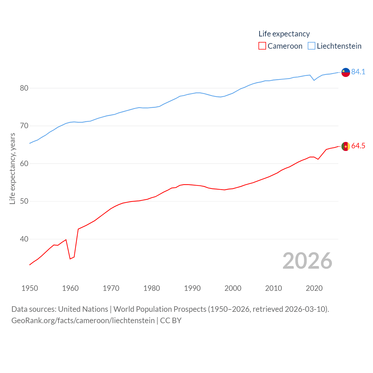Cameroon has a population of 29.1M (ranked 52/197), compared with 40.4K in Liechtenstein (ranked 190/197). Cameroon's land area is 182,514 sq mi versus 61.8 sq mi for Liechtenstein (ranked 52nd vs. 192nd).