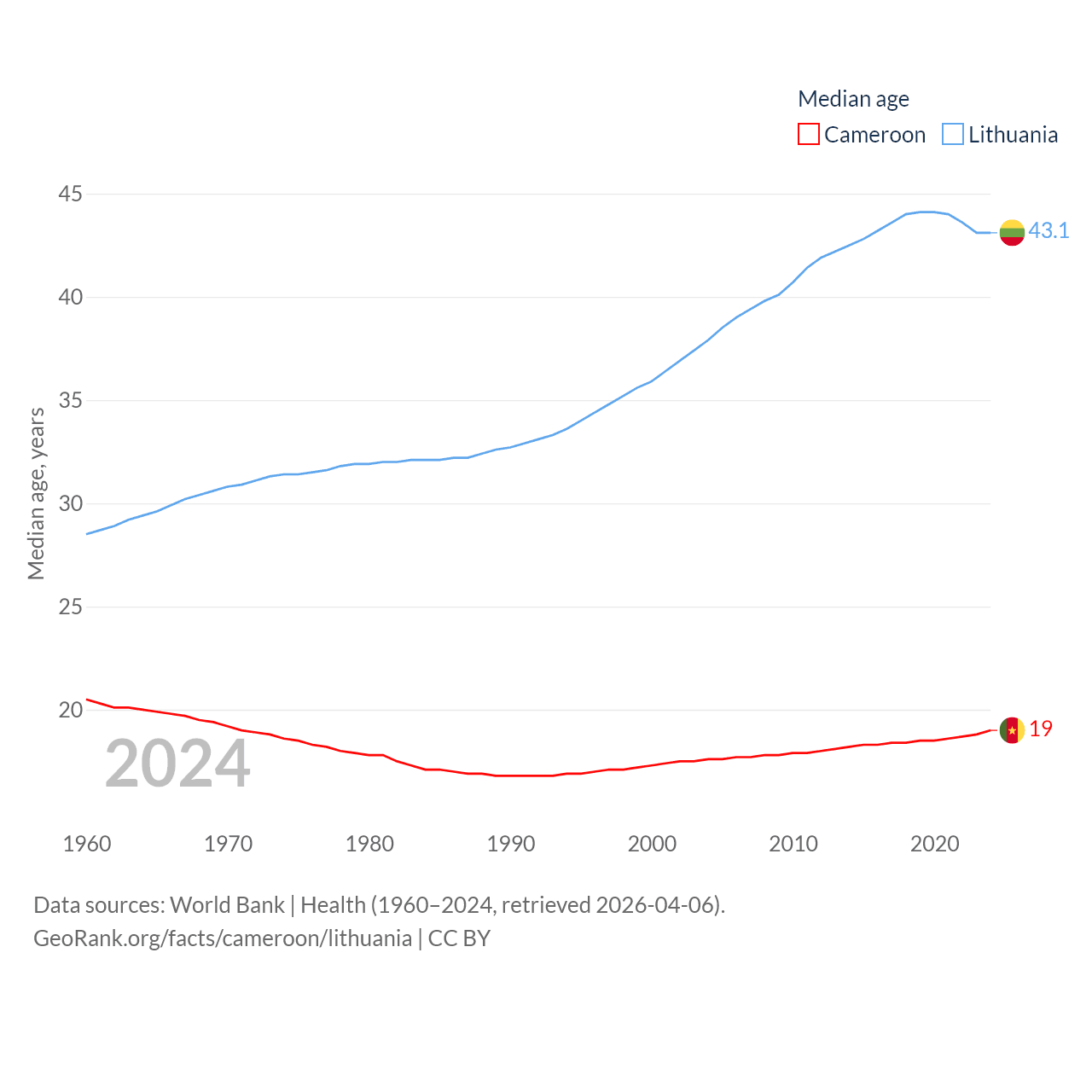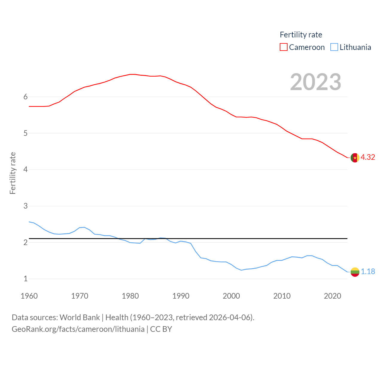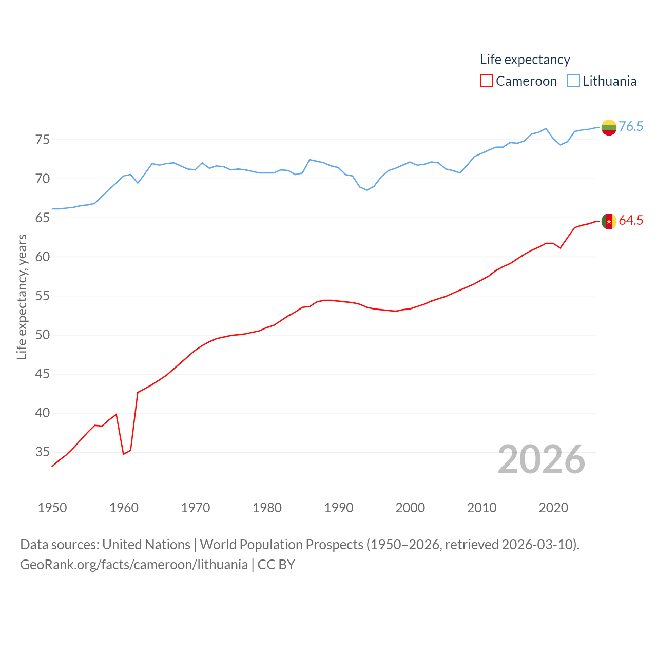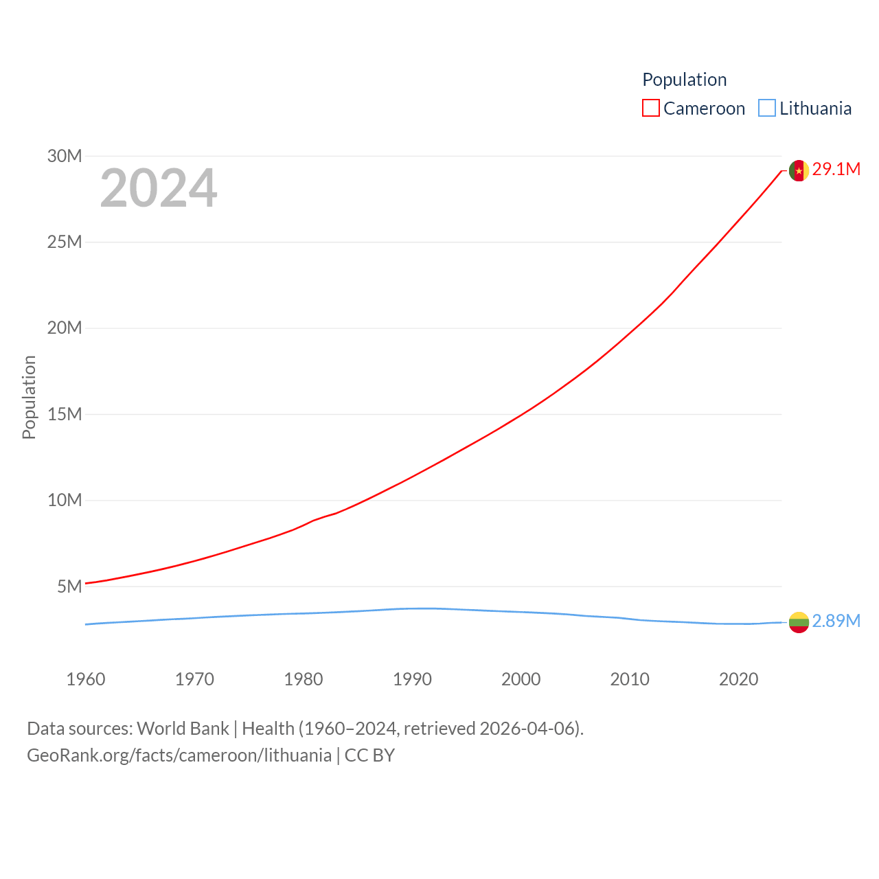Cameroon has a population of 29.1M (ranked 52/197), compared with 2.89M in Lithuania (ranked 137/197). Cameroon's land area is 182,514 sq mi versus 24,170 sq mi for Lithuania (ranked 52nd vs. 120th).