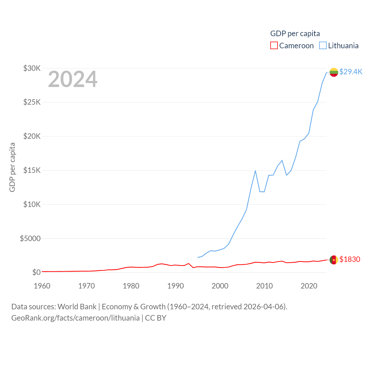 By GDP, Cameroon ranks 91/197 ($53.3B) and Lithuania ranks 79/197 ($84.9B). By GDP per capita, Cameroon ranks 158/197 ($1,830), while Lithuania ranks 43/197 ($29,384).