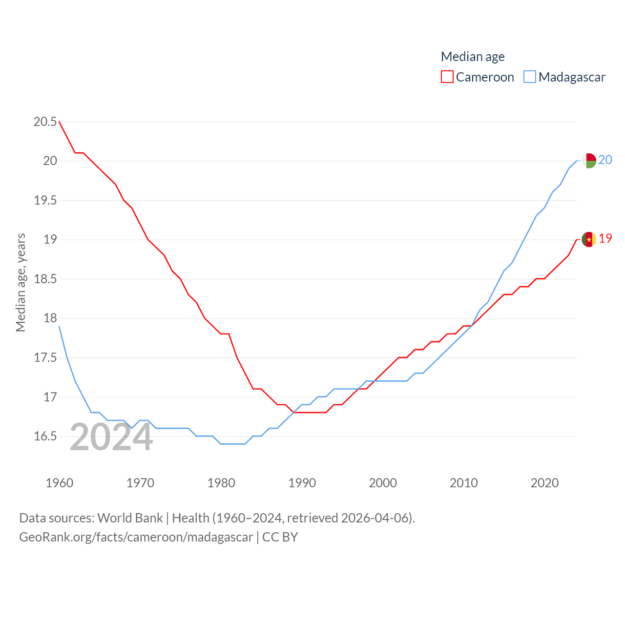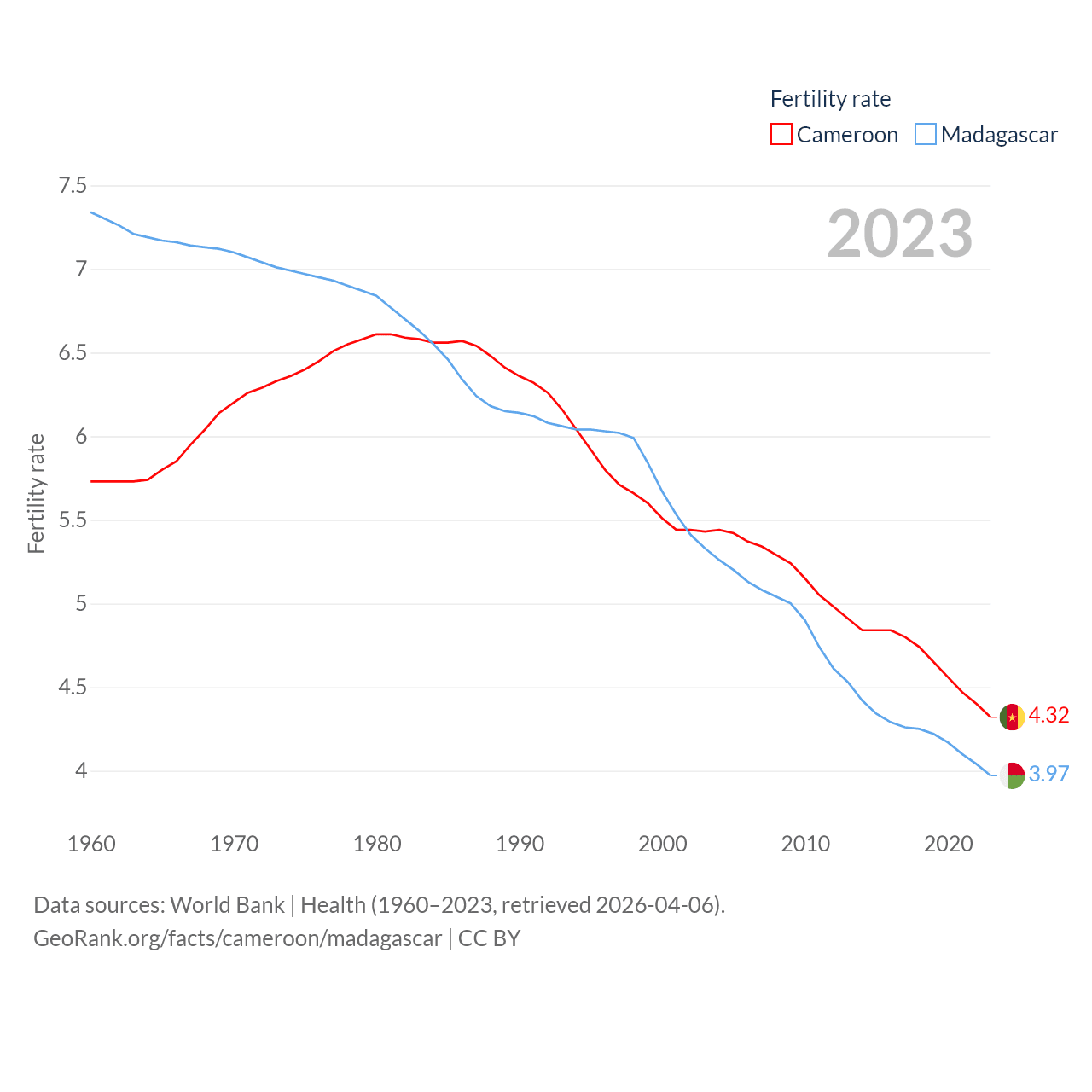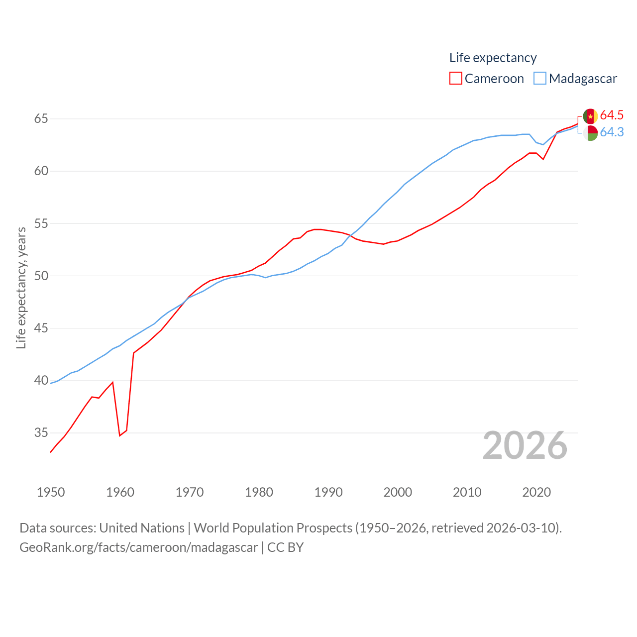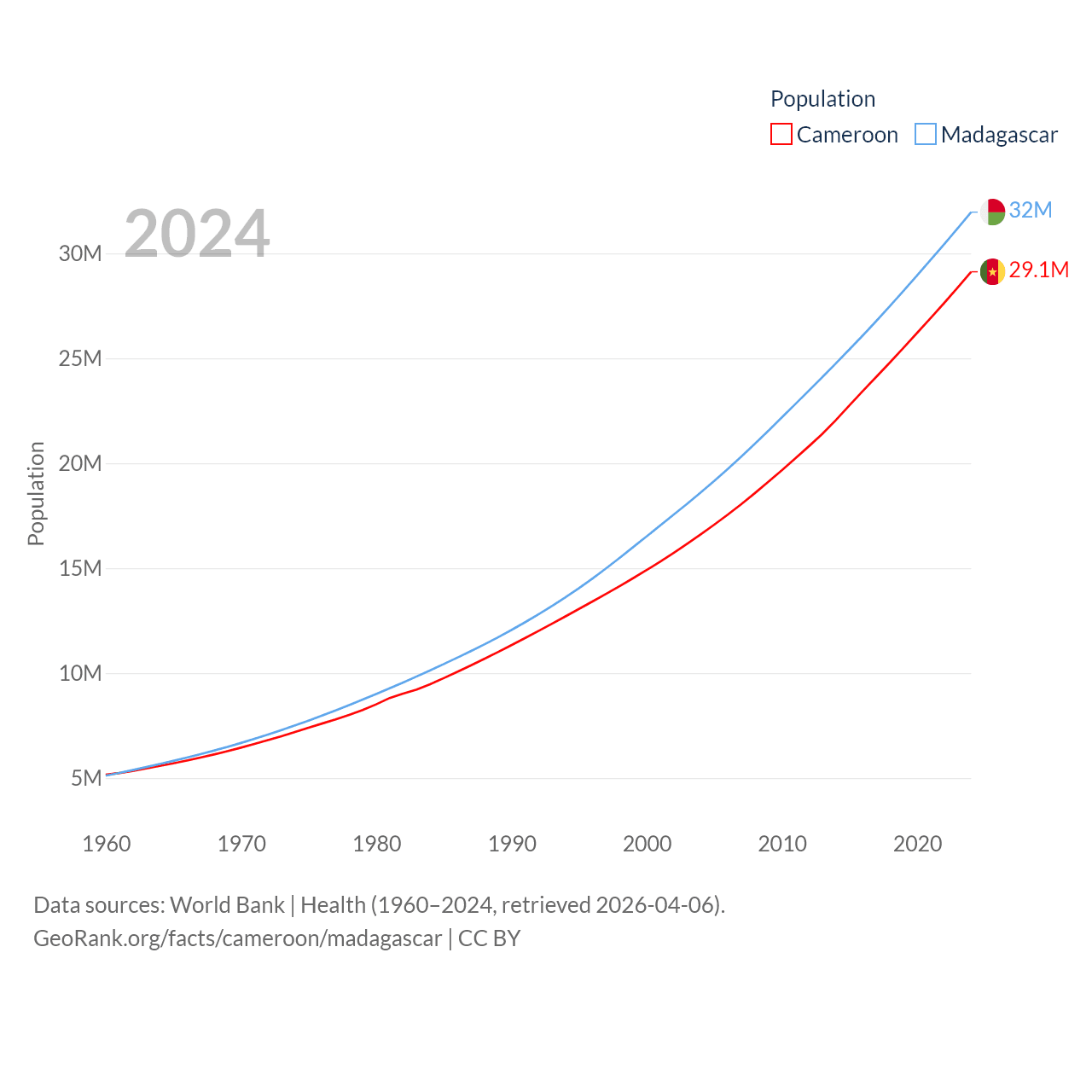 Cameroon has a population of 29.1M (ranked 52/197), compared with 32M in Madagascar (ranked 49/197). Cameroon's land area is 182,514 sq mi versus 224,634 sq mi for Madagascar (ranked 52nd vs. 44th).