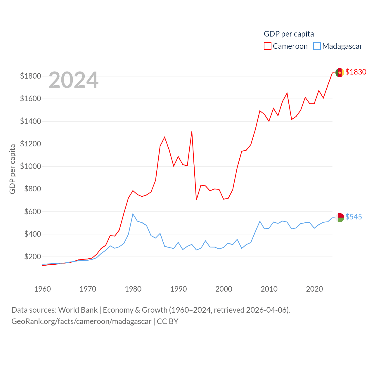 By GDP, Cameroon ranks 91/197 ($53.3B) and Madagascar ranks 136/197 ($17.4B). By GDP per capita, Cameroon ranks 158/197 ($1,830), while Madagascar ranks 193/197 ($545).