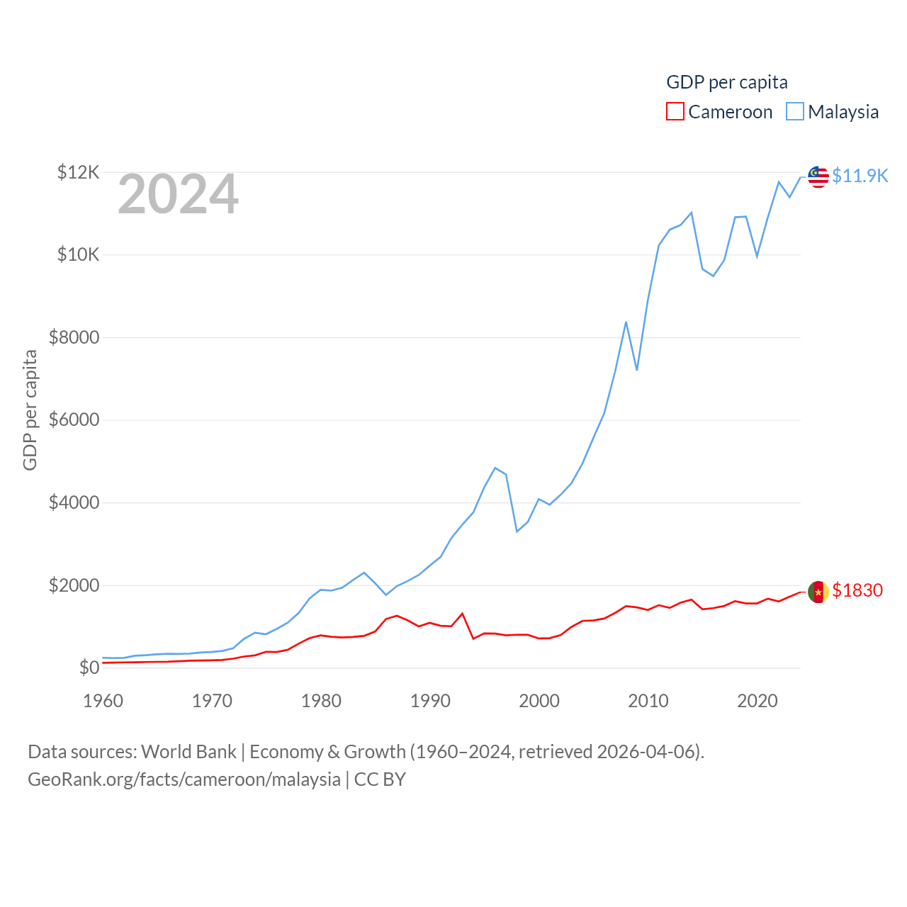 By GDP, Cameroon ranks 91/197 ($53.3B) and Malaysia ranks 38/197 ($422B). By GDP per capita, Cameroon ranks 158/197 ($1,830), while Malaysia ranks 79/197 ($11,874).