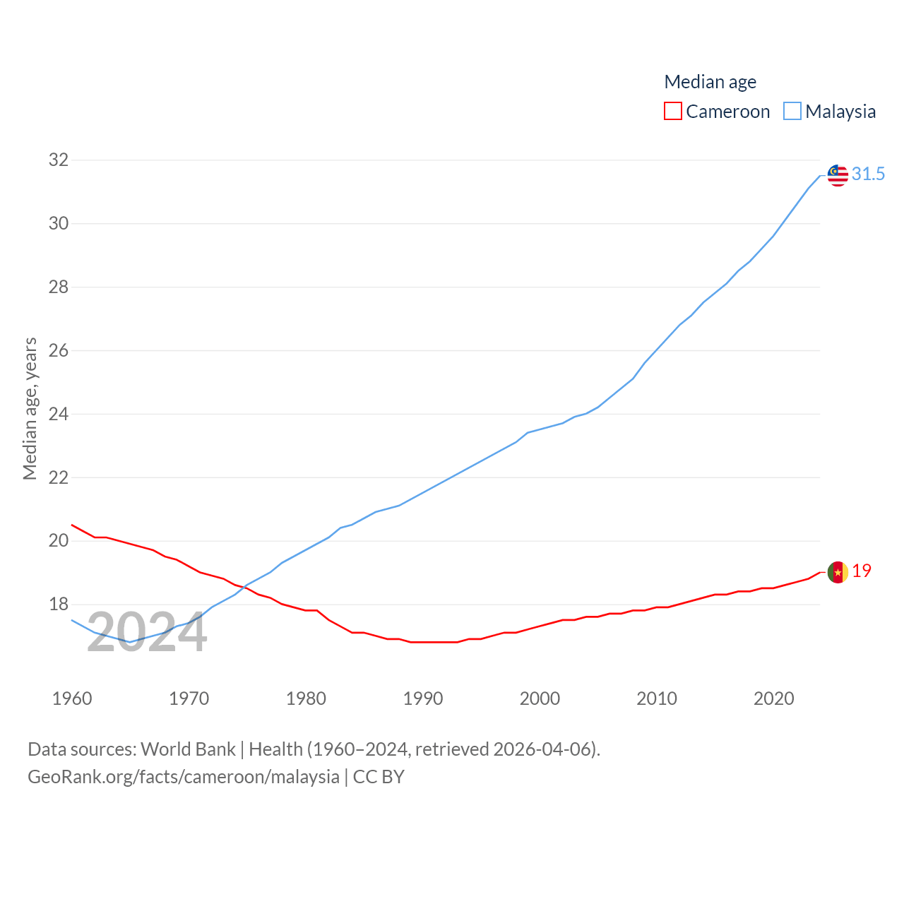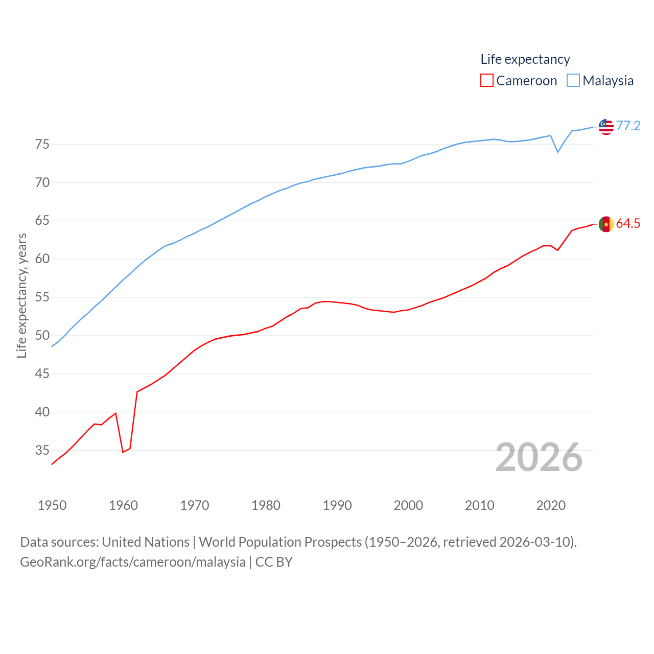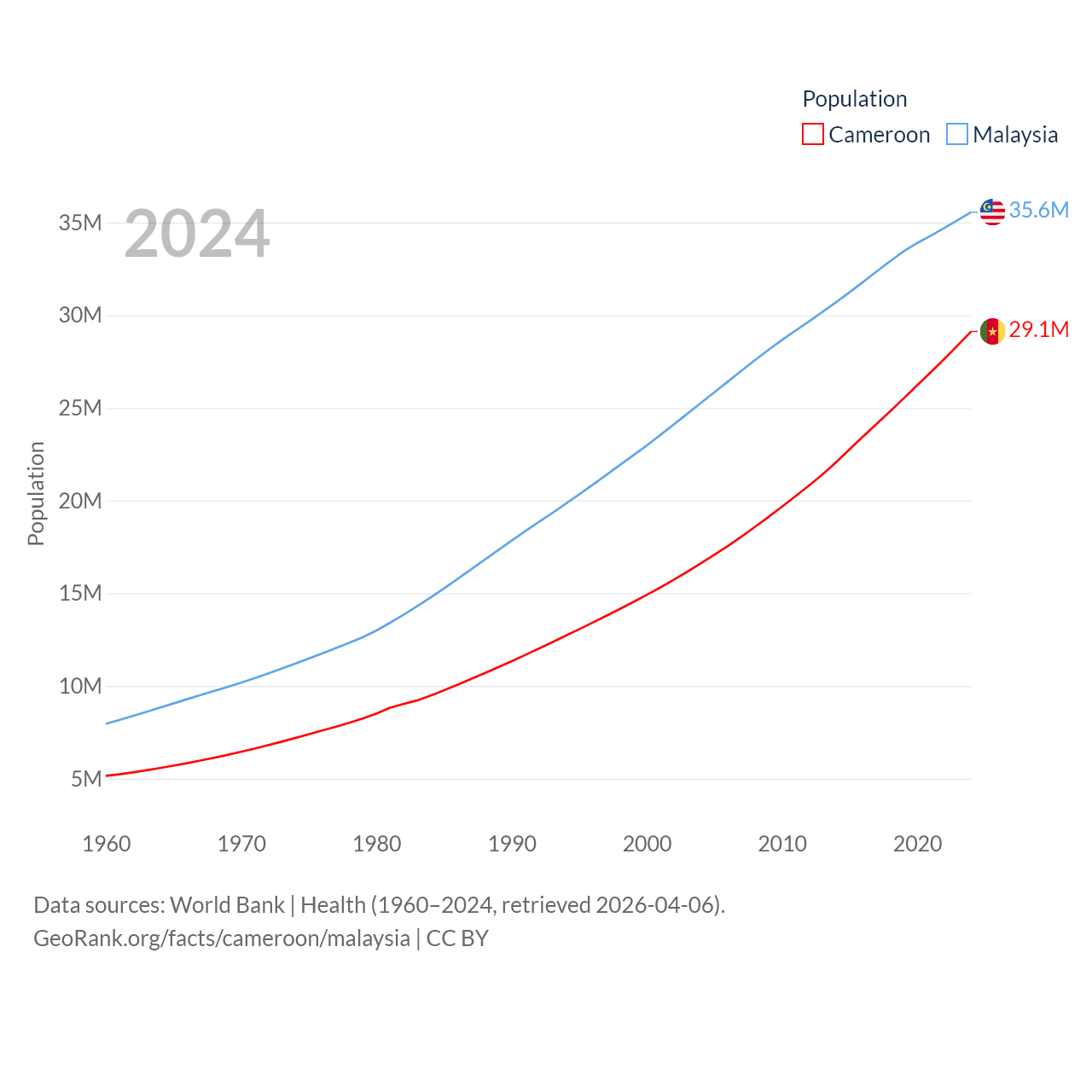 Cameroon has a population of 29.1M (ranked 52/197), compared with 35.6M in Malaysia (ranked 44/197). Cameroon's land area is 182,514 sq mi versus 126,854 sq mi for Malaysia (ranked 52nd vs. 65th).