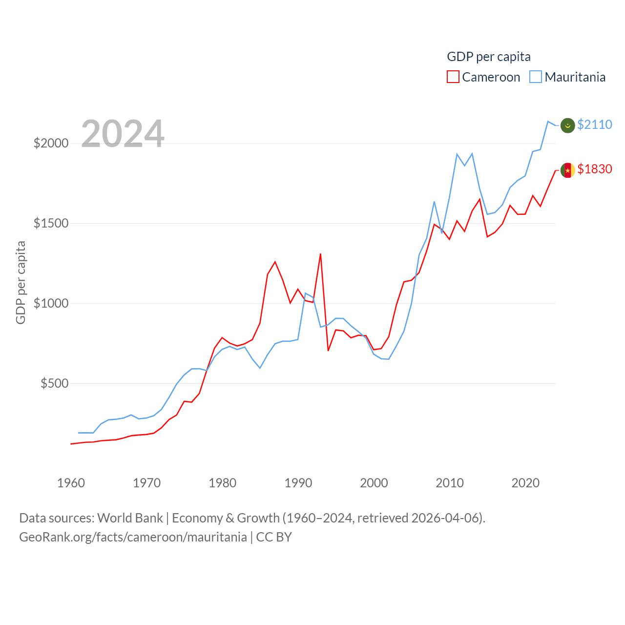 By GDP, Cameroon ranks 91/197 ($53.3B) and Mauritania ranks 153/197 ($10.9B). By GDP per capita, Cameroon ranks 158/197 ($1,830), while Mauritania ranks 156/197 ($2,110).