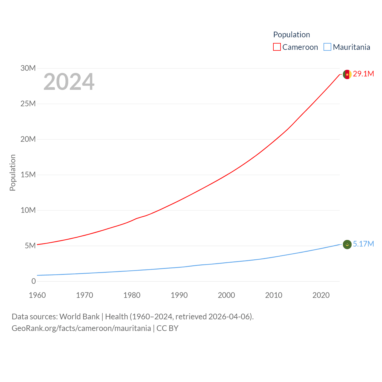 Cameroon has a population of 29.1M (ranked 52/197), compared with 5.17M in Mauritania (ranked 125/197). Cameroon's land area is 182,514 sq mi versus 397,955 sq mi for Mauritania (ranked 52nd vs. 28th).