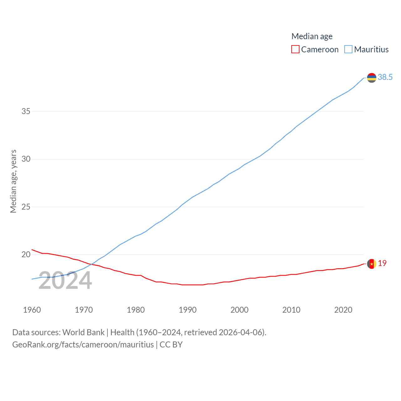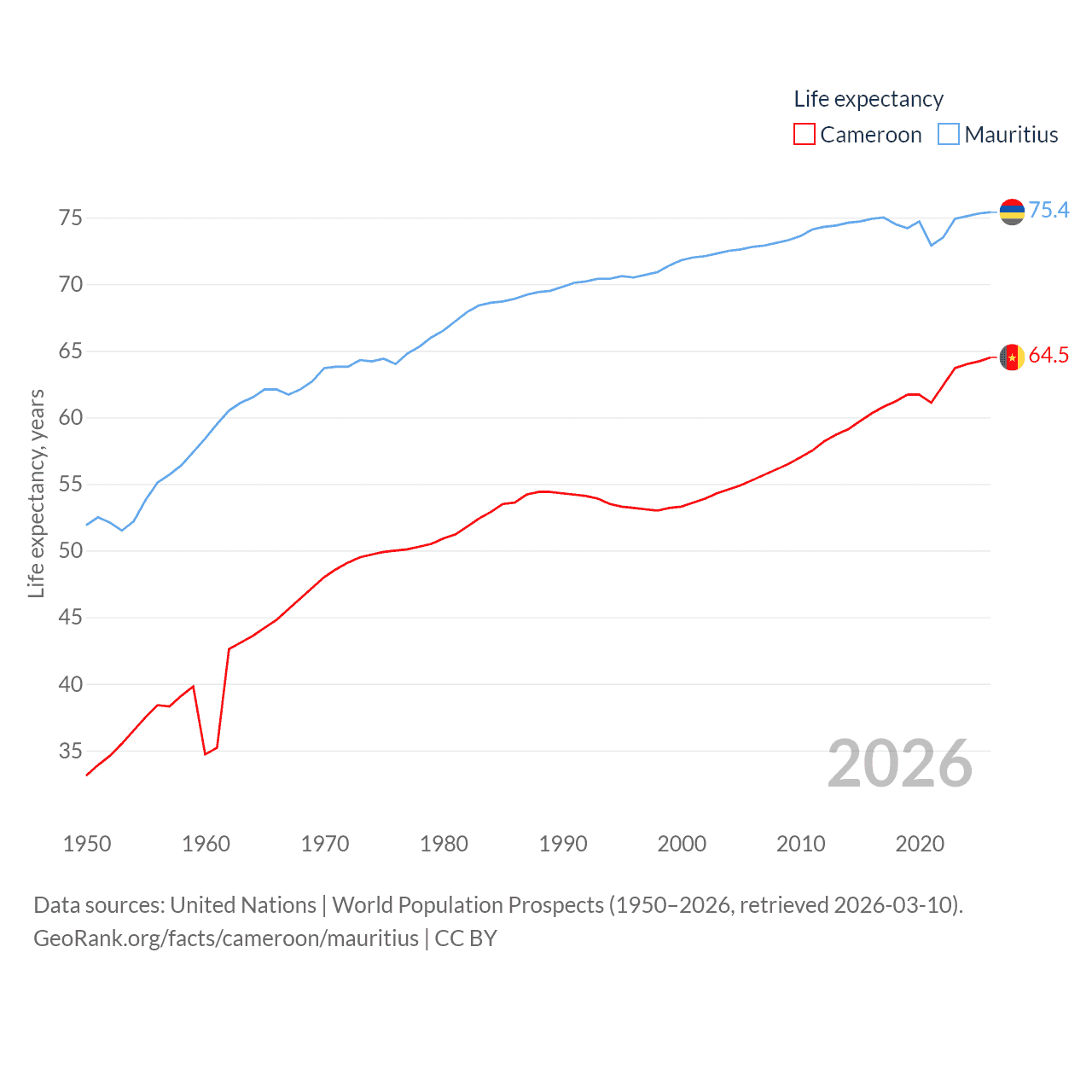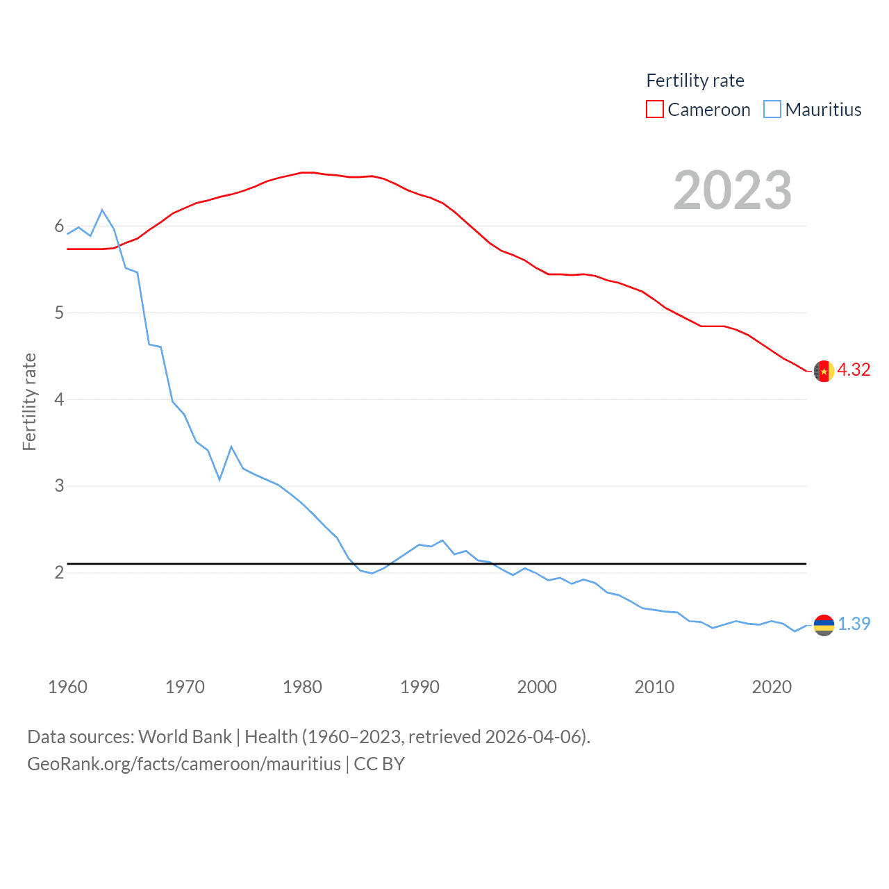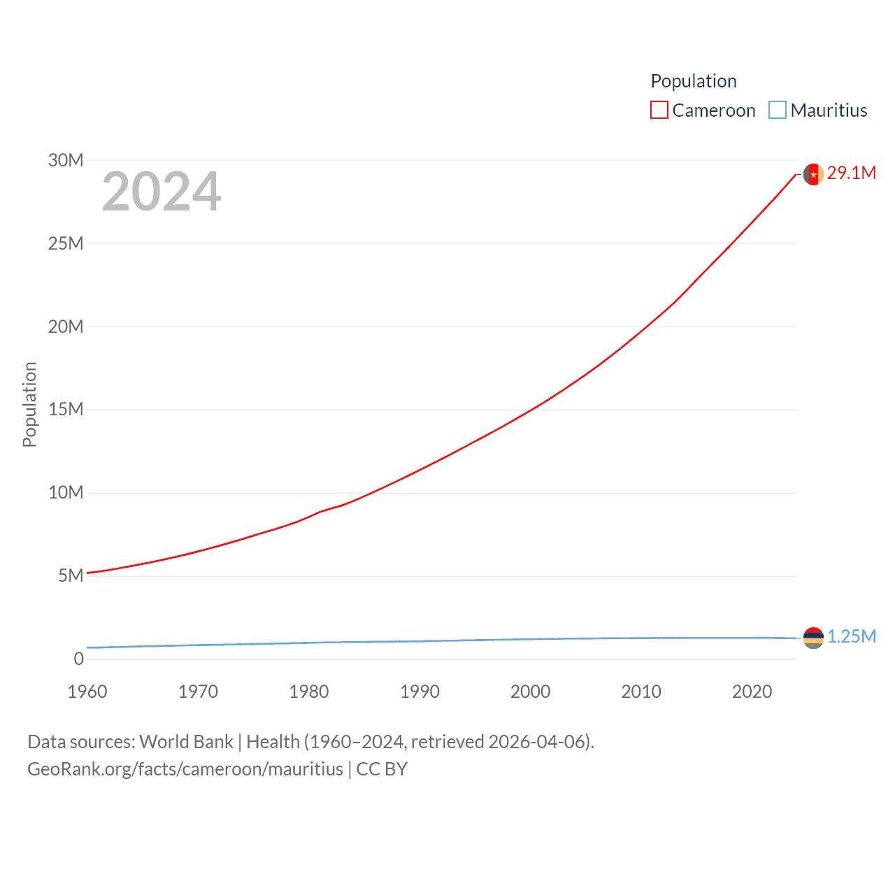 Cameroon has a population of 29.1M (ranked 52/197), compared with 1.25M in Mauritius (ranked 156/197). Cameroon's land area is 182,514 sq mi versus 771 sq mi for Mauritius (ranked 52nd vs. 170th).