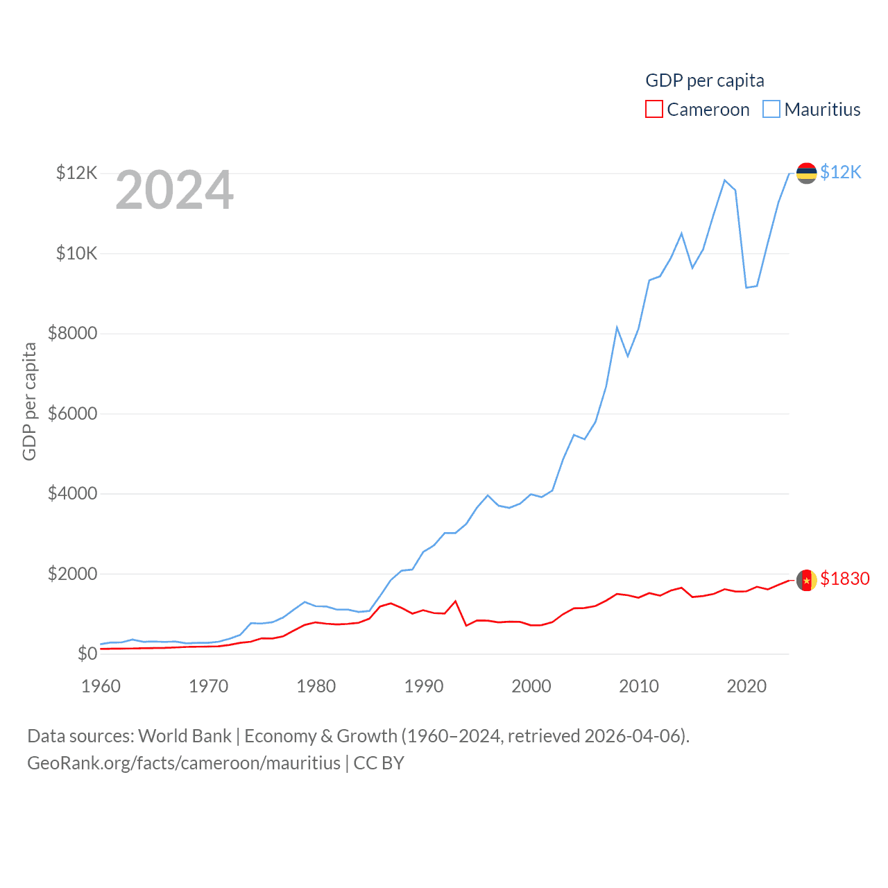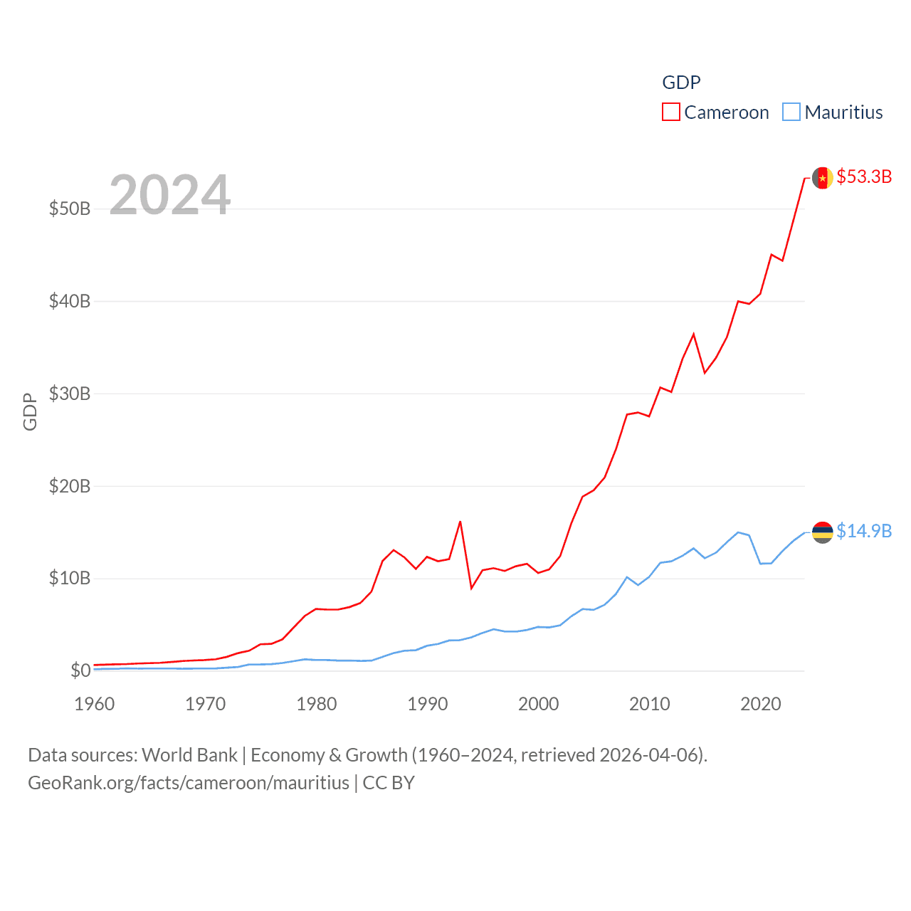 By GDP, Cameroon ranks 91/197 ($53.3B) and Mauritius ranks 143/197 ($14.9B). By GDP per capita, Cameroon ranks 158/197 ($1,830), while Mauritius ranks 78/197 ($11,991).
