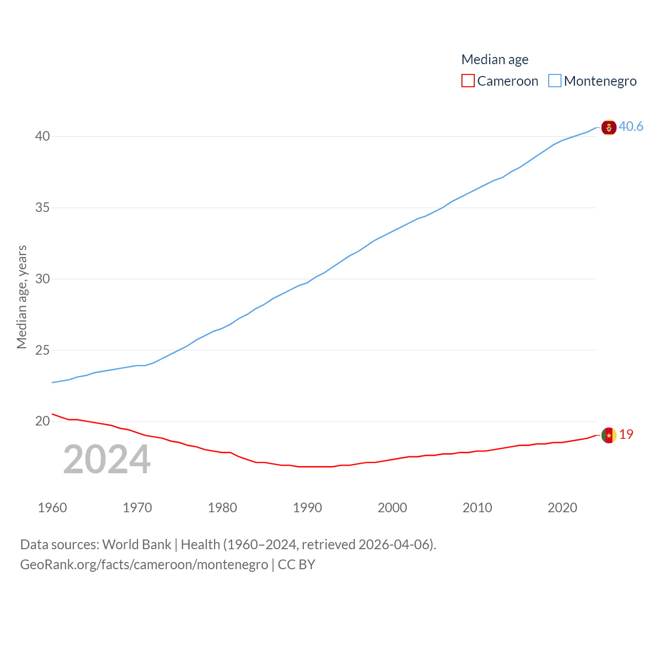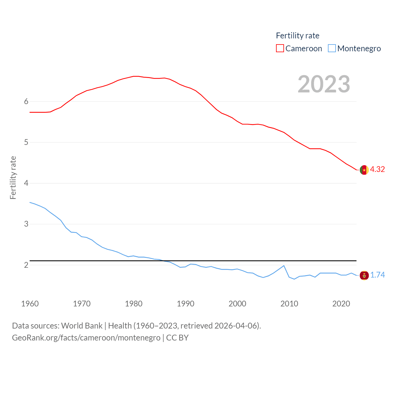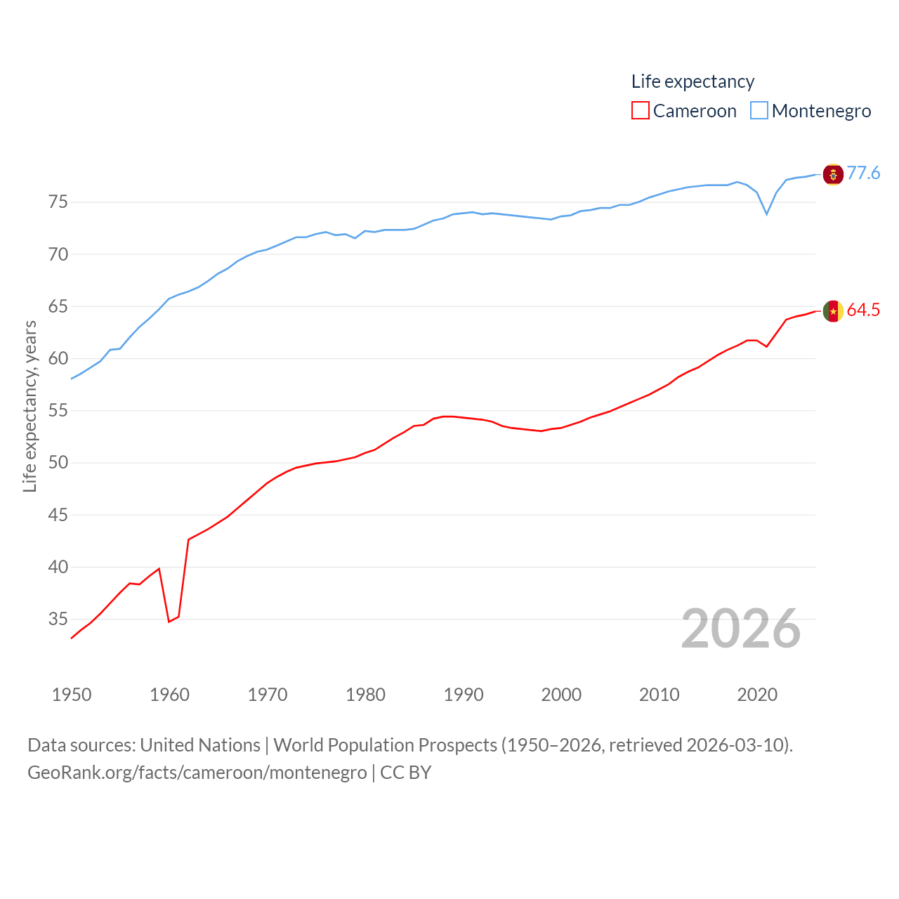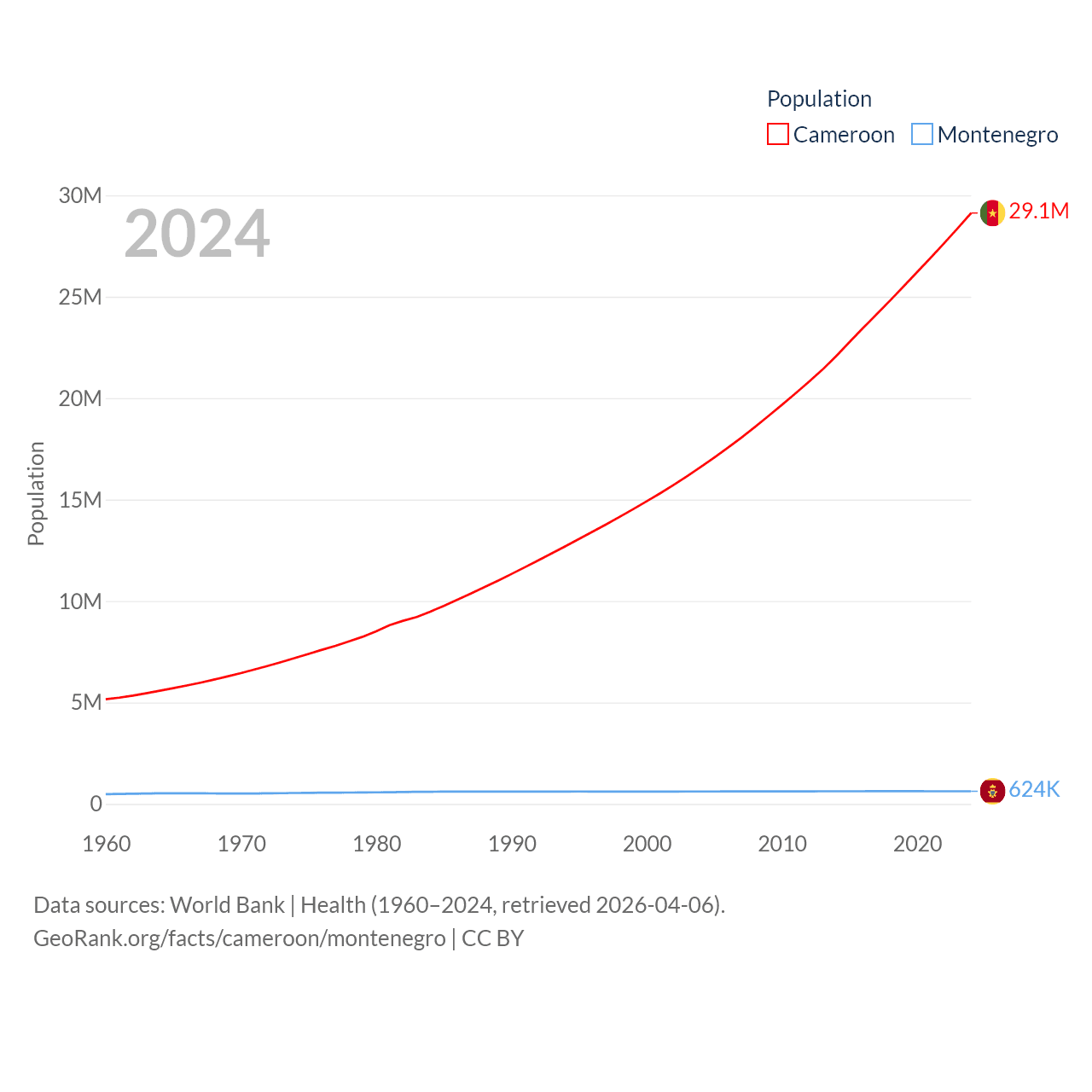 Cameroon has a population of 29.1M (ranked 52/197), compared with 624K in Montenegro (ranked 166/197). Cameroon's land area is 182,514 sq mi versus 5,193 sq mi for Montenegro (ranked 52nd vs. 156th).
