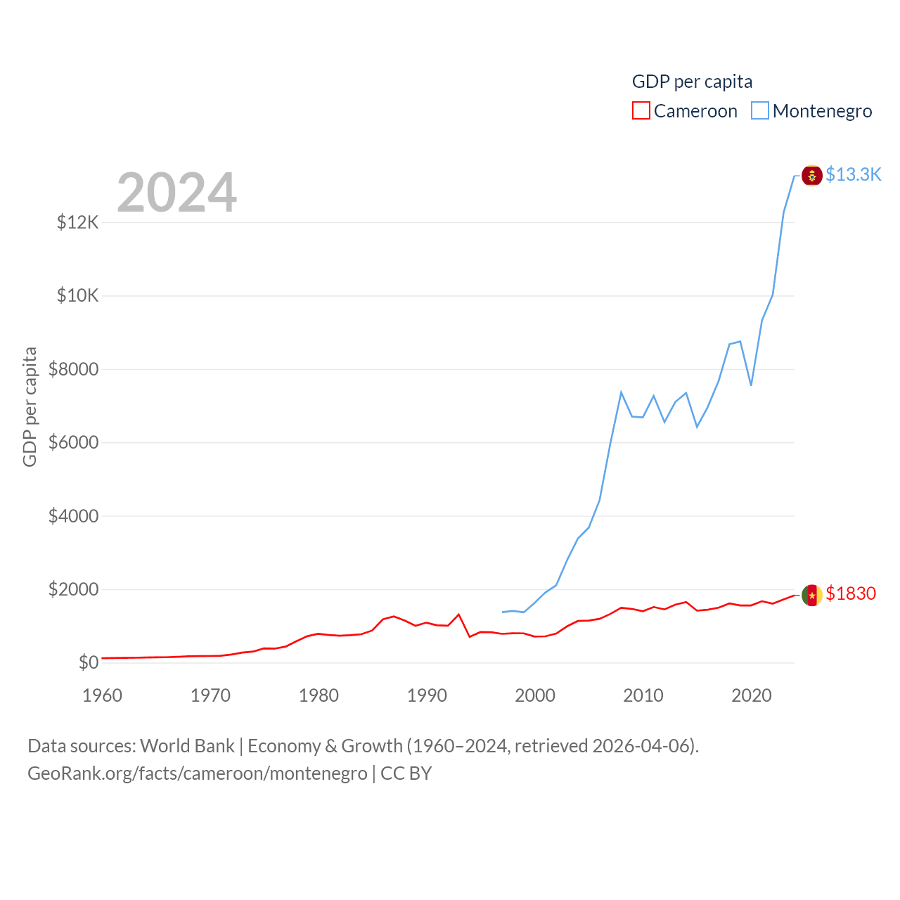 By GDP, Cameroon ranks 91/197 ($53.3B) and Montenegro ranks 155/197 ($8.27B). By GDP per capita, Cameroon ranks 158/197 ($1,830), while Montenegro ranks 77/197 ($13,263).