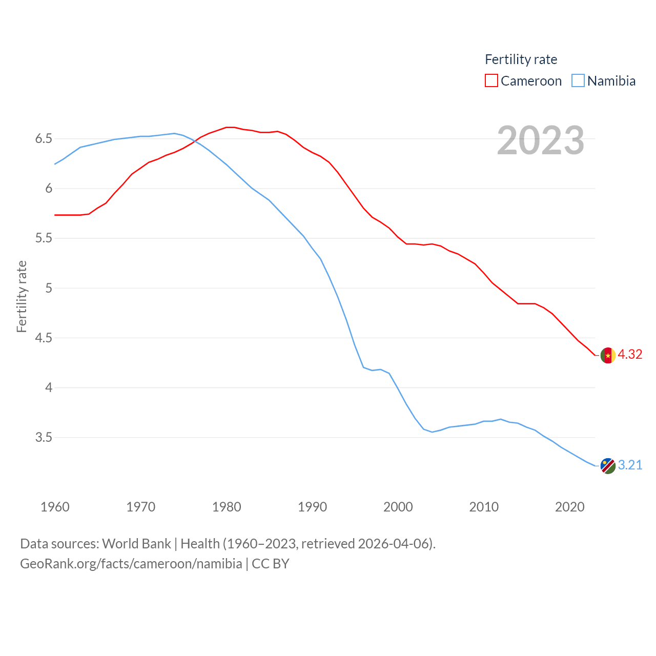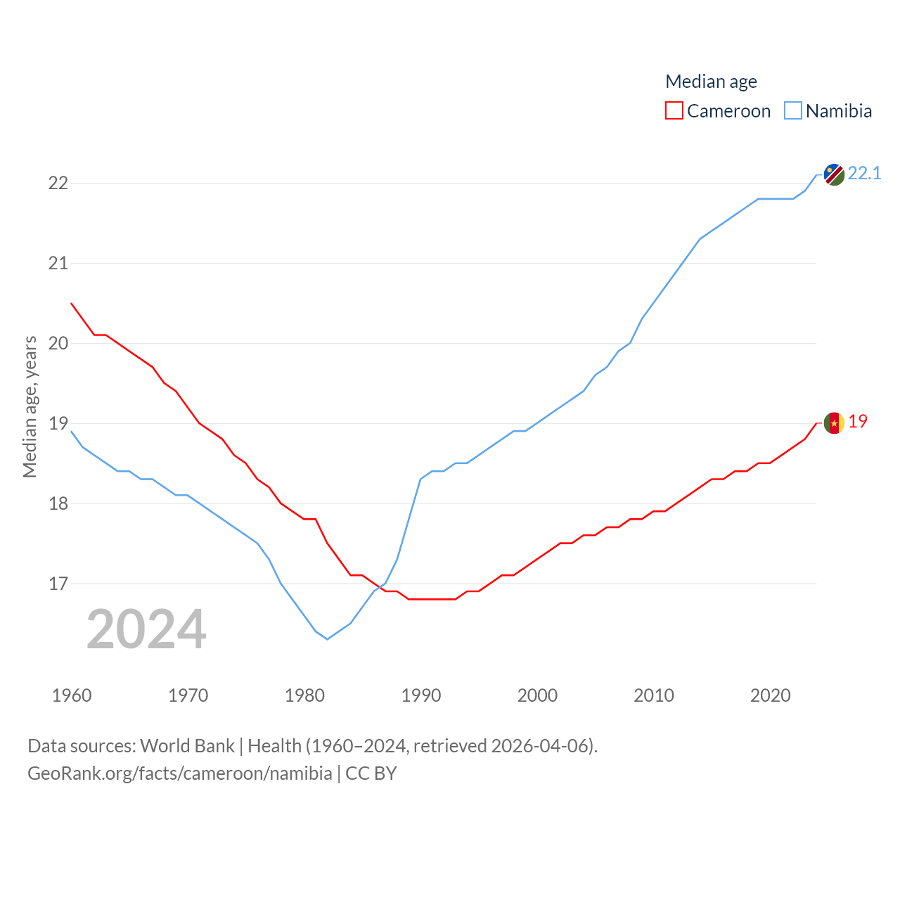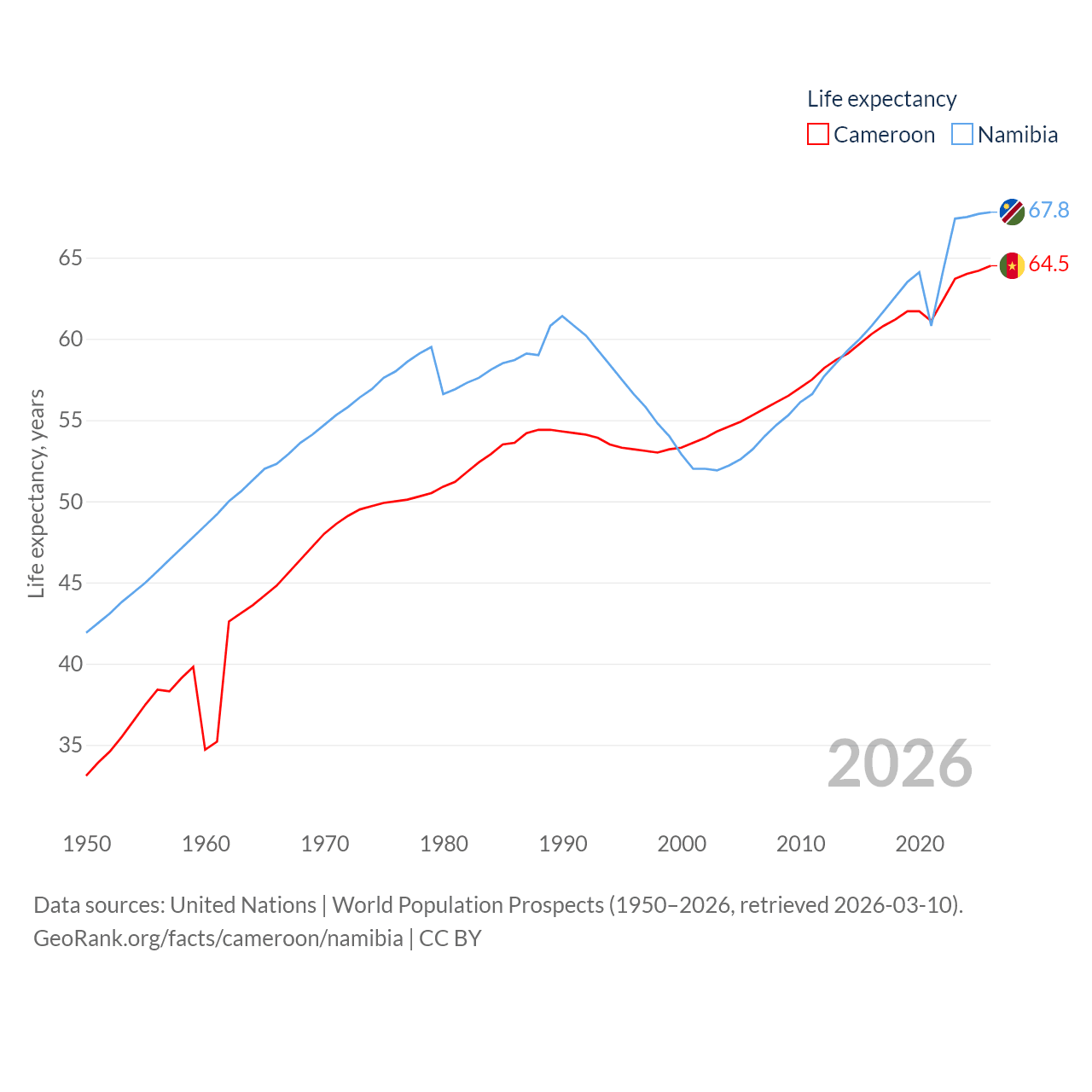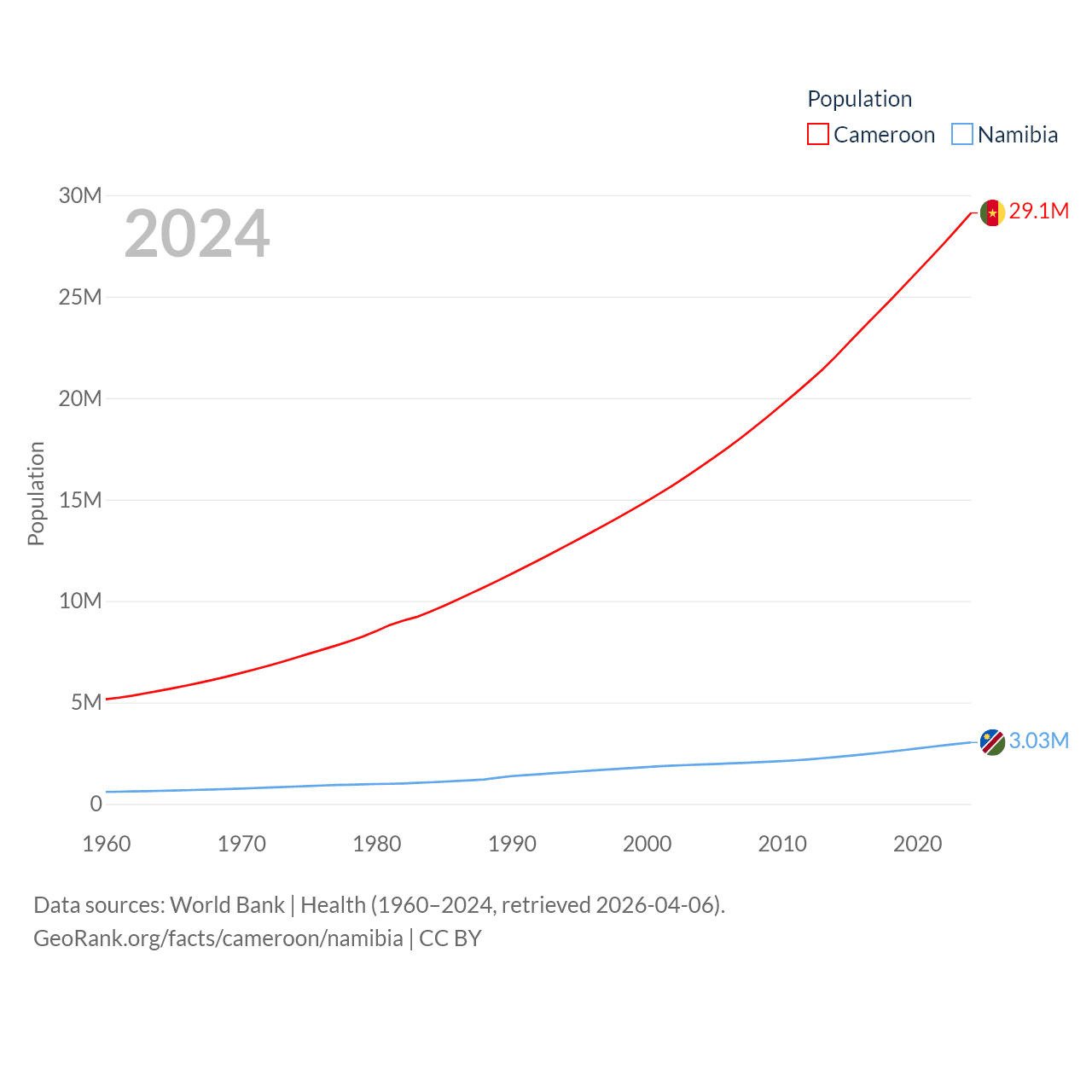 Cameroon has a population of 29.1M (ranked 52/197), compared with 3.03M in Namibia (ranked 136/197). Cameroon's land area is 182,514 sq mi versus 317,874 sq mi for Namibia (ranked 52nd vs. 33rd).