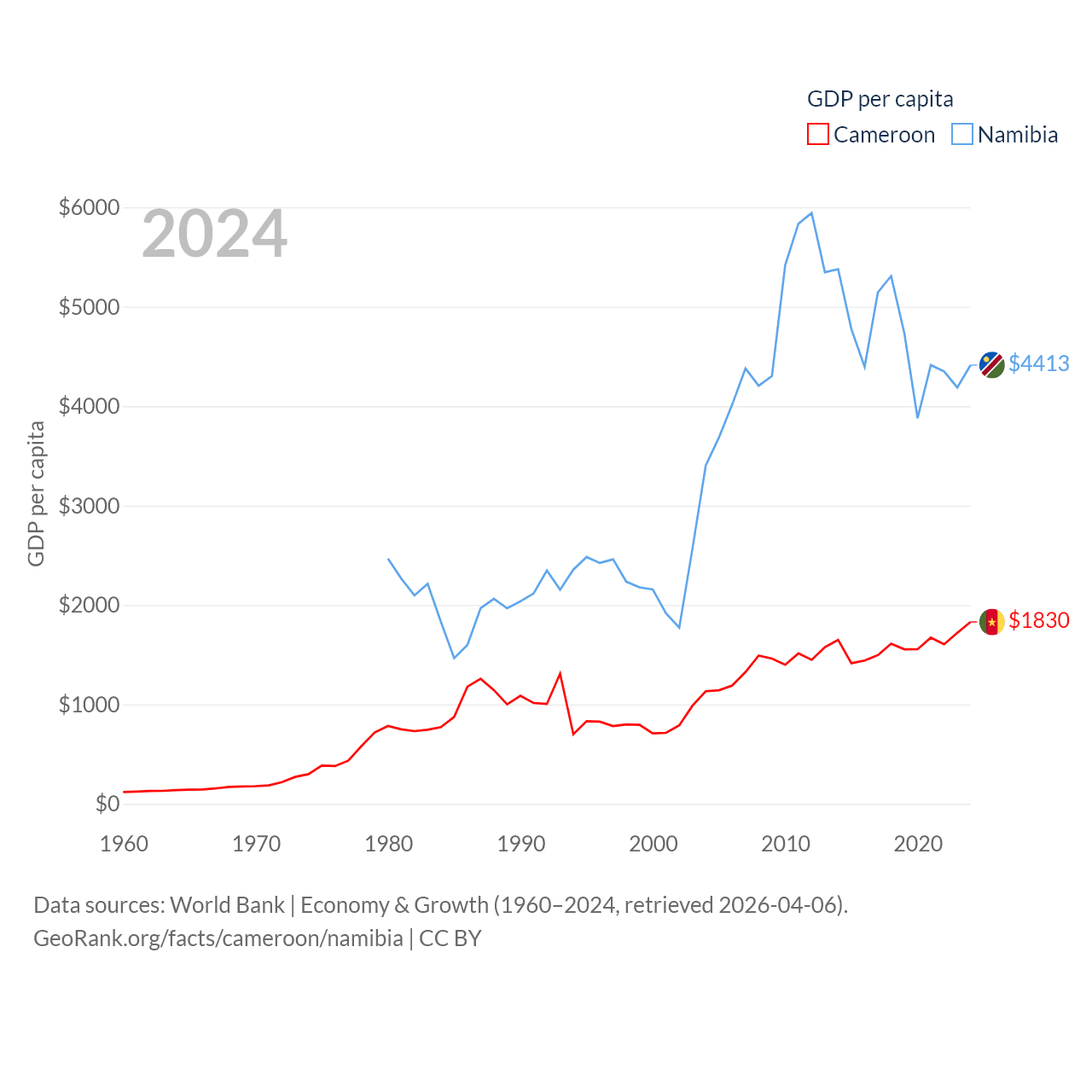 By GDP, Cameroon ranks 91/197 ($53.3B) and Namibia ranks 147/197 ($13.4B). By GDP per capita, Cameroon ranks 158/197 ($1,830), while Namibia ranks 126/197 ($4,413).
